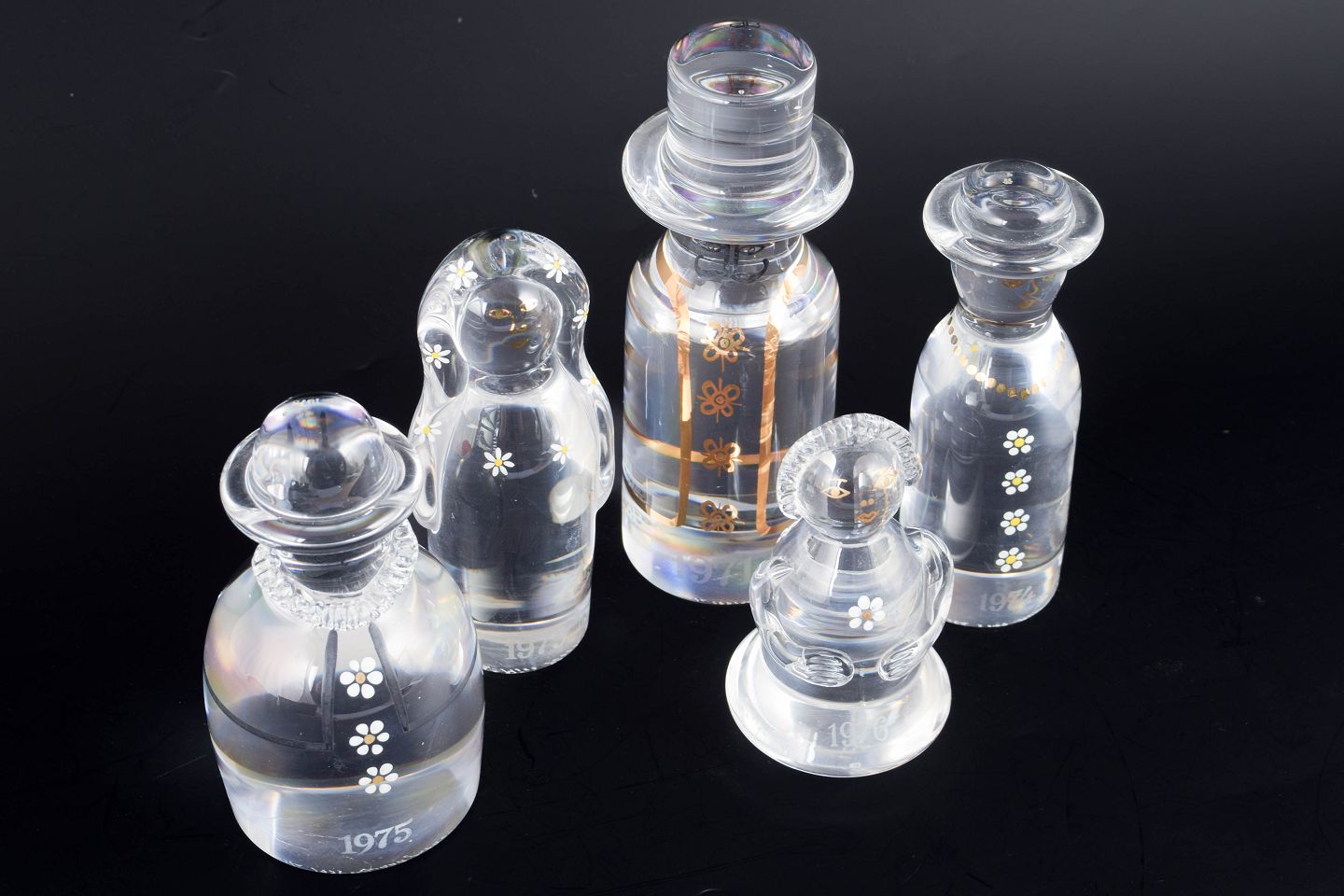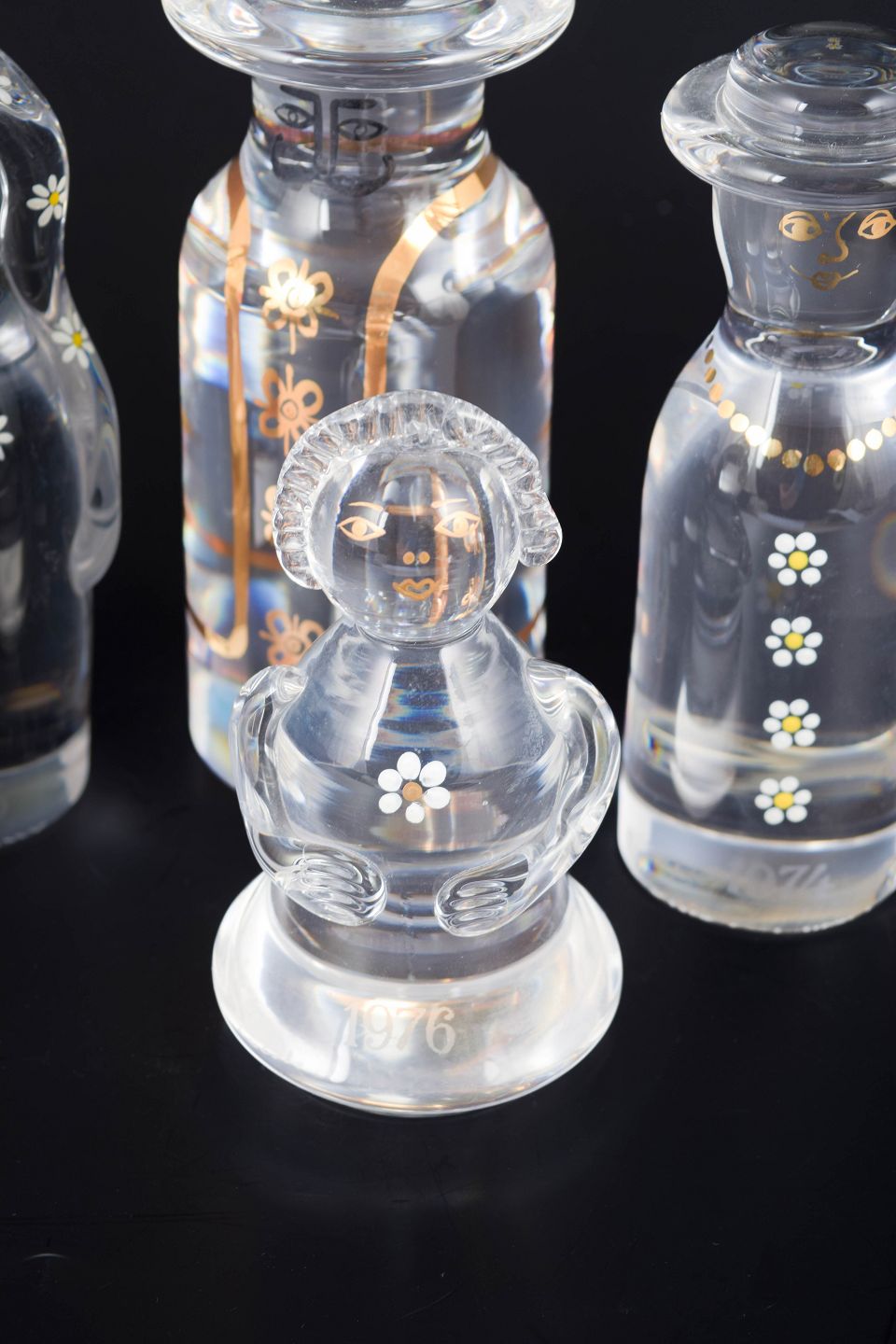 Håndlavede kunstglasfigurer i klart glas med enkle, stiliserede former og dekorative hvide og gyldne blomstermotiver, der repræsenterer en familiegruppe.