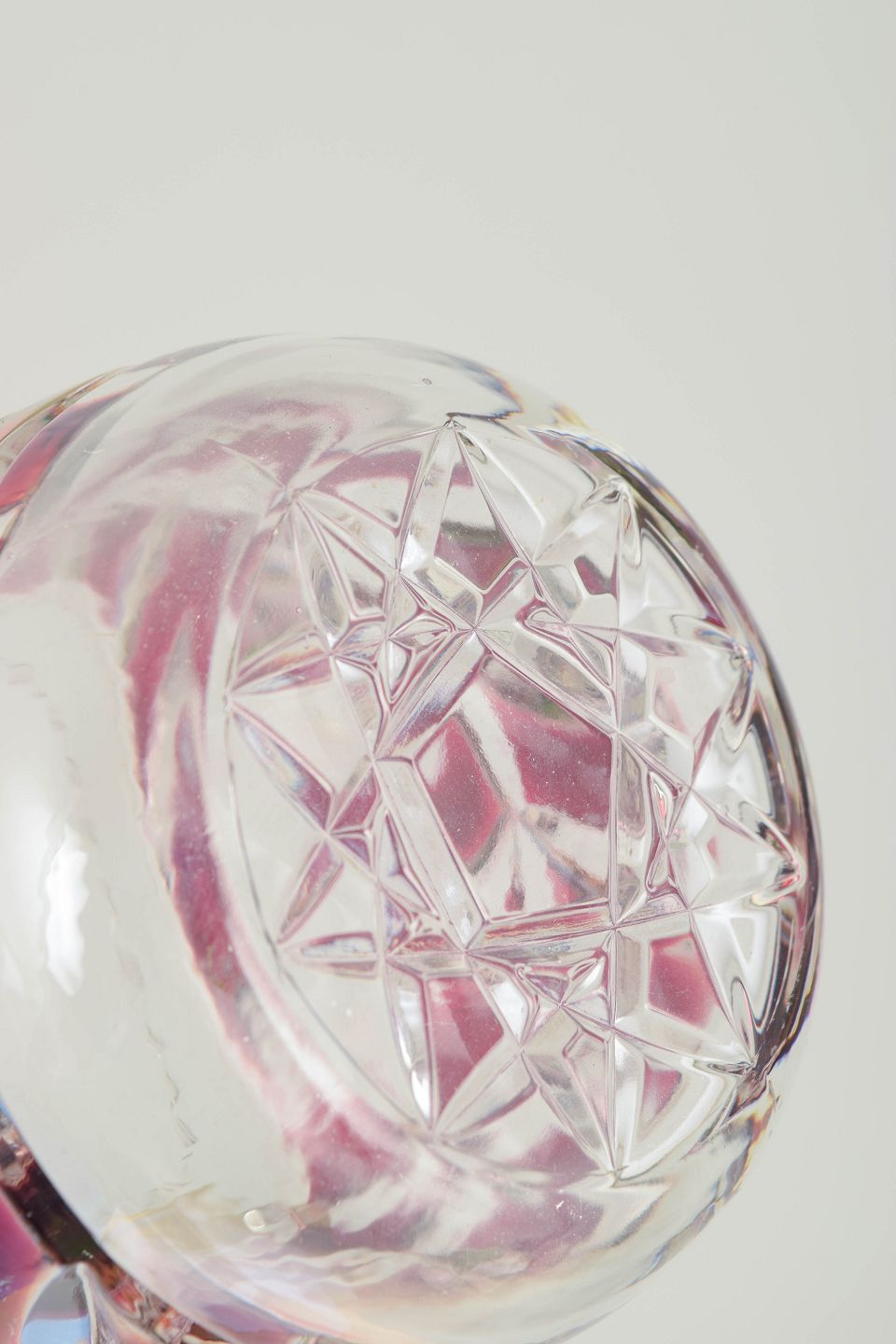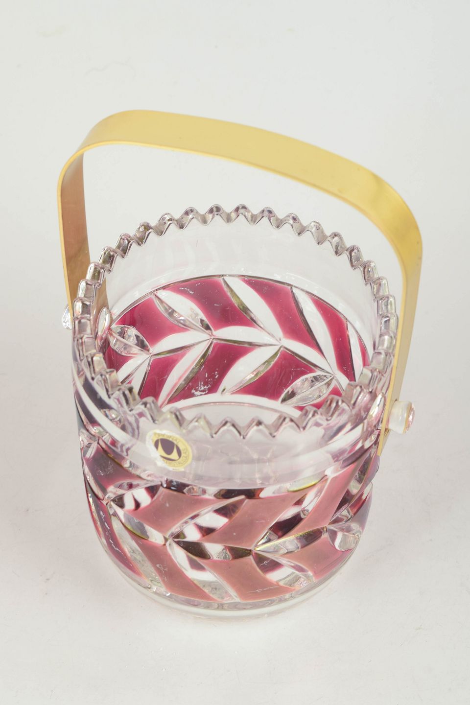 Presset og slebet krystal i klart og rosa tonet glas med geometrisk slebet mønster, med håndtag i messing og original mærkat.