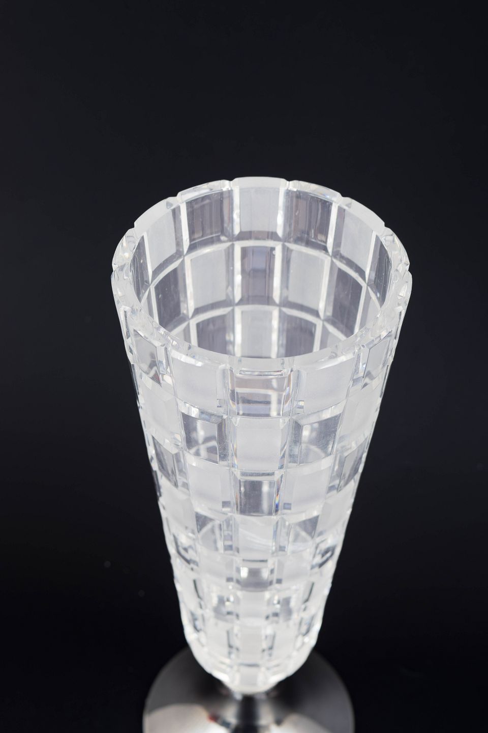 Modernist vase in cut crystal with a geometric pattern and base in 813 silver. The design features a clear, architectural structure characteristic of Finnish glass design of the period.