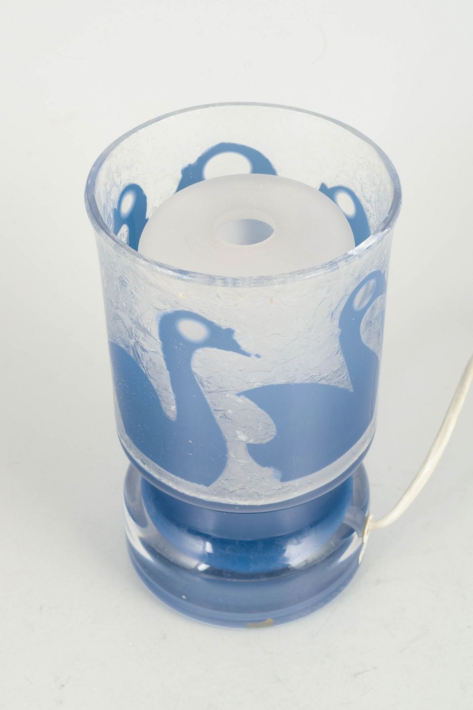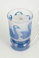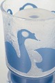 Dekorativ bordlampe i kunstglas med matteret overflade og blå svanemotiv, monteret på klar og blå glasfod. Signeret under bunden.