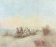Stemningsfuld komposition med hestetrukken vogn og figurer i et åbent landskab, udført i en lys og let koloristisk palet med bløde overgange og atmosfærisk dybde. Signeret.