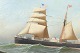 Detaljeret skildring af dampskib under sejl på åbent hav med bølgende sø og klar himmel. Motivet er udført med stor præcision i gengivelsen af skibets konstruktion og rigging, karakteristisk for kunstnerens maritime værker.