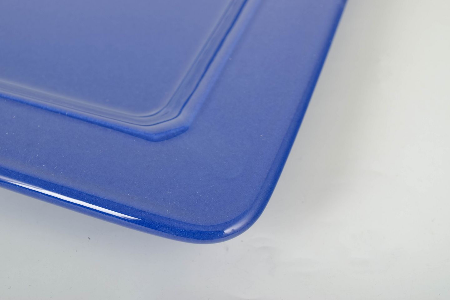 Enkelt og elegant sæt i keramik bestående af tre store firkantede tallerkner med ensartet dyb blå glasur.