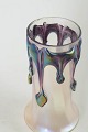 Balusterformet vase i mundblæst glas med matteret, iriserende overflade og kraftigt pålagt glas i flerfarvede, flydende former ned langs halsen.