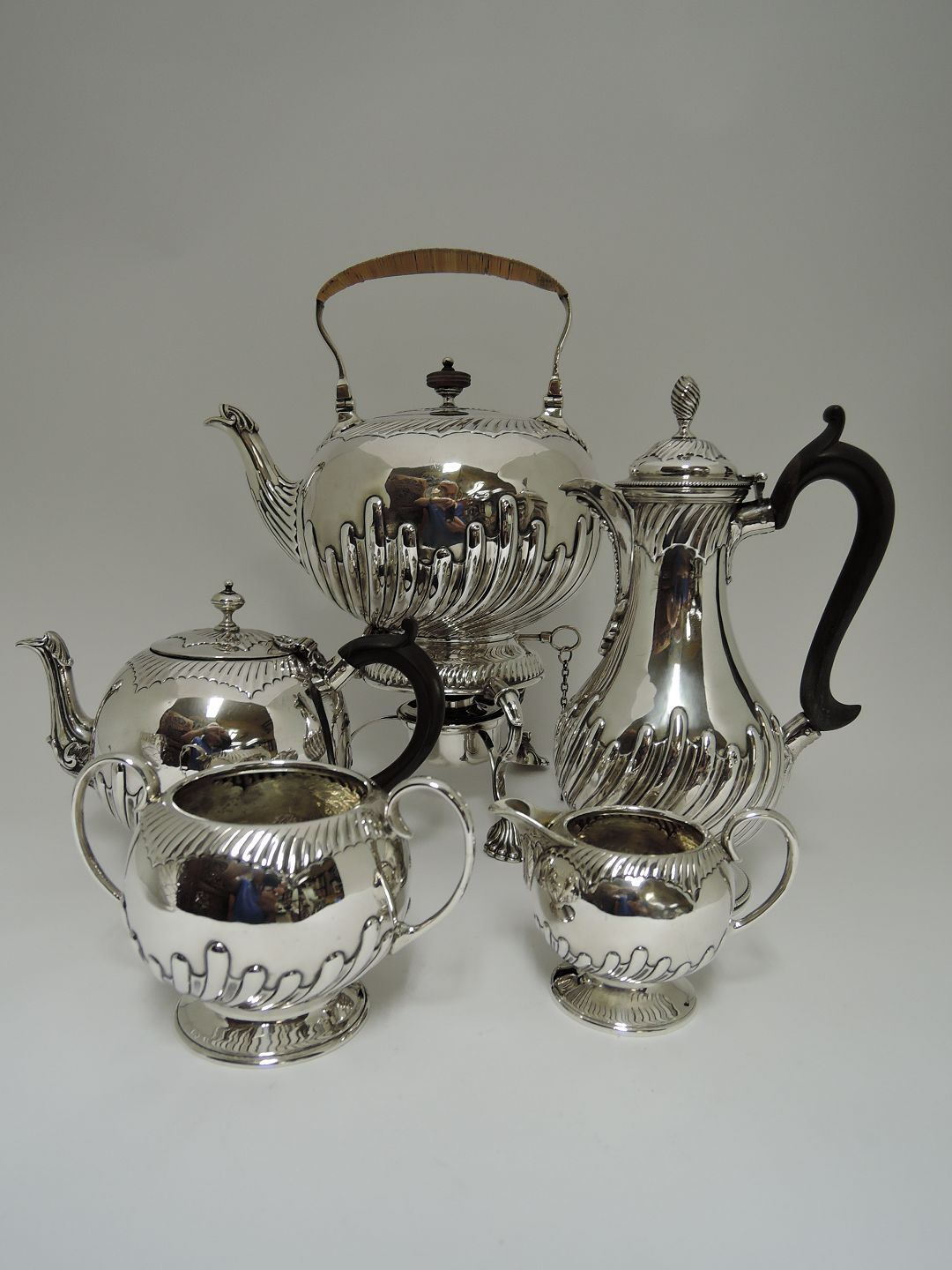 Engelsk The & Kaffe service. Sterling (925). 5 dele, bestående af Svingthekande, thekande, kaffekande, sukkerskål og flødekande. Produceret London 1881.