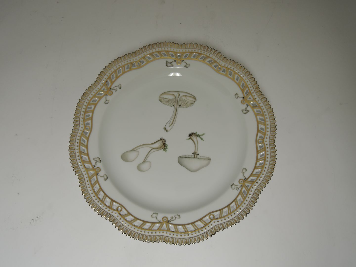 Royal Copenhagen. Flora Danica. Svampe tallerken med gennembrudt kant. Diameter 29 cm. ( 1 sortering ) Acaricus splendens Vahl