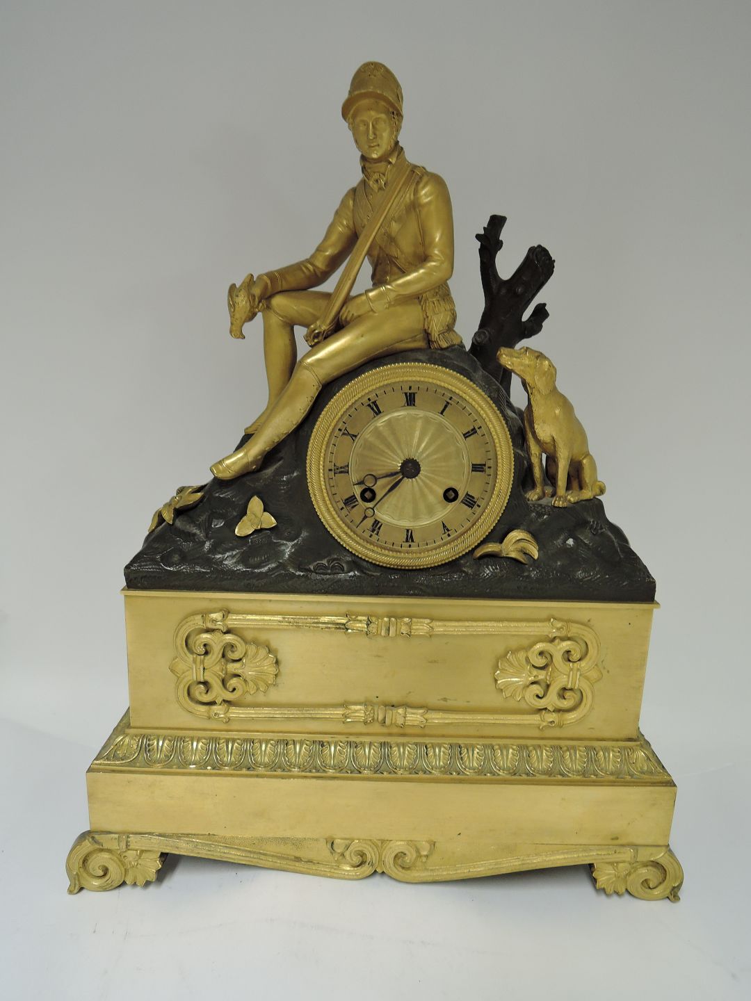 French Bronze clock with Seated Hunter. Height 39 cm. Produced approx. 1840. Clockwork is alright.