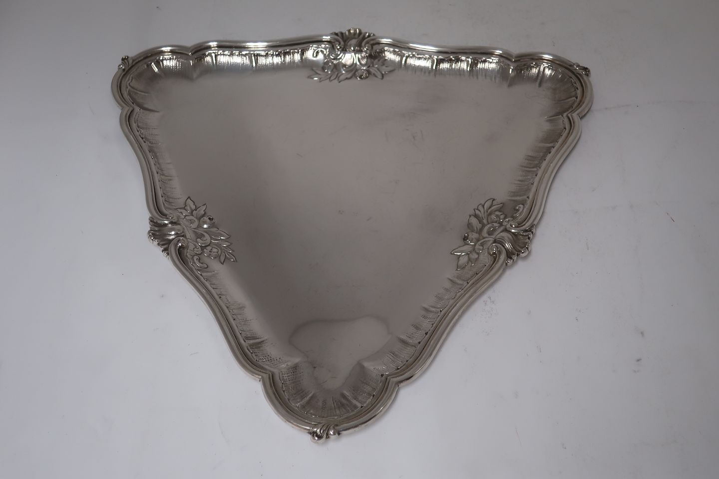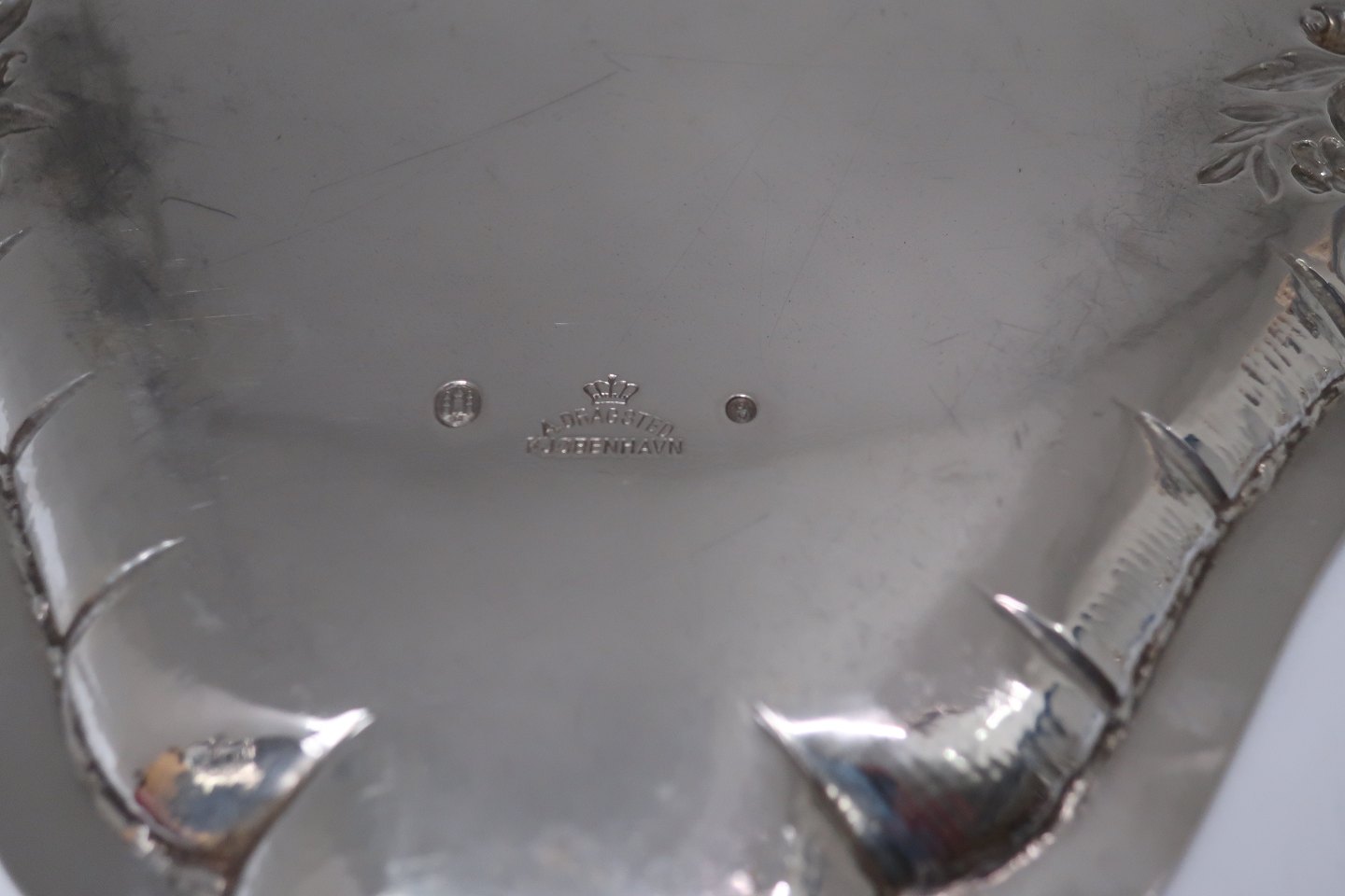 A. Dragsted. Sølv (830). Trekantet sølvbakke. Længde 30 cm. Produceret 1908.