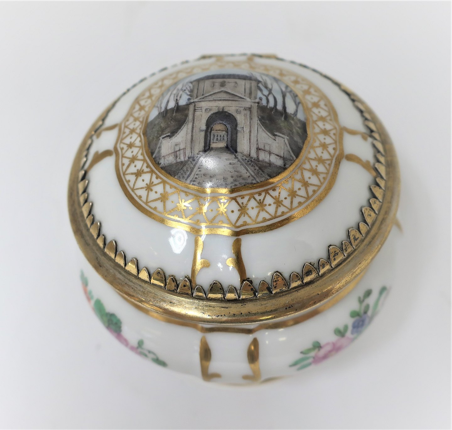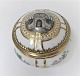 Royal Copenhagen. Bonbonniere porcelain lid with motif from Kastellet, Copenhagen. Mounting of gilded sterling silver, A. Michelsen, Copenhagen 1920. H. 9 cm.