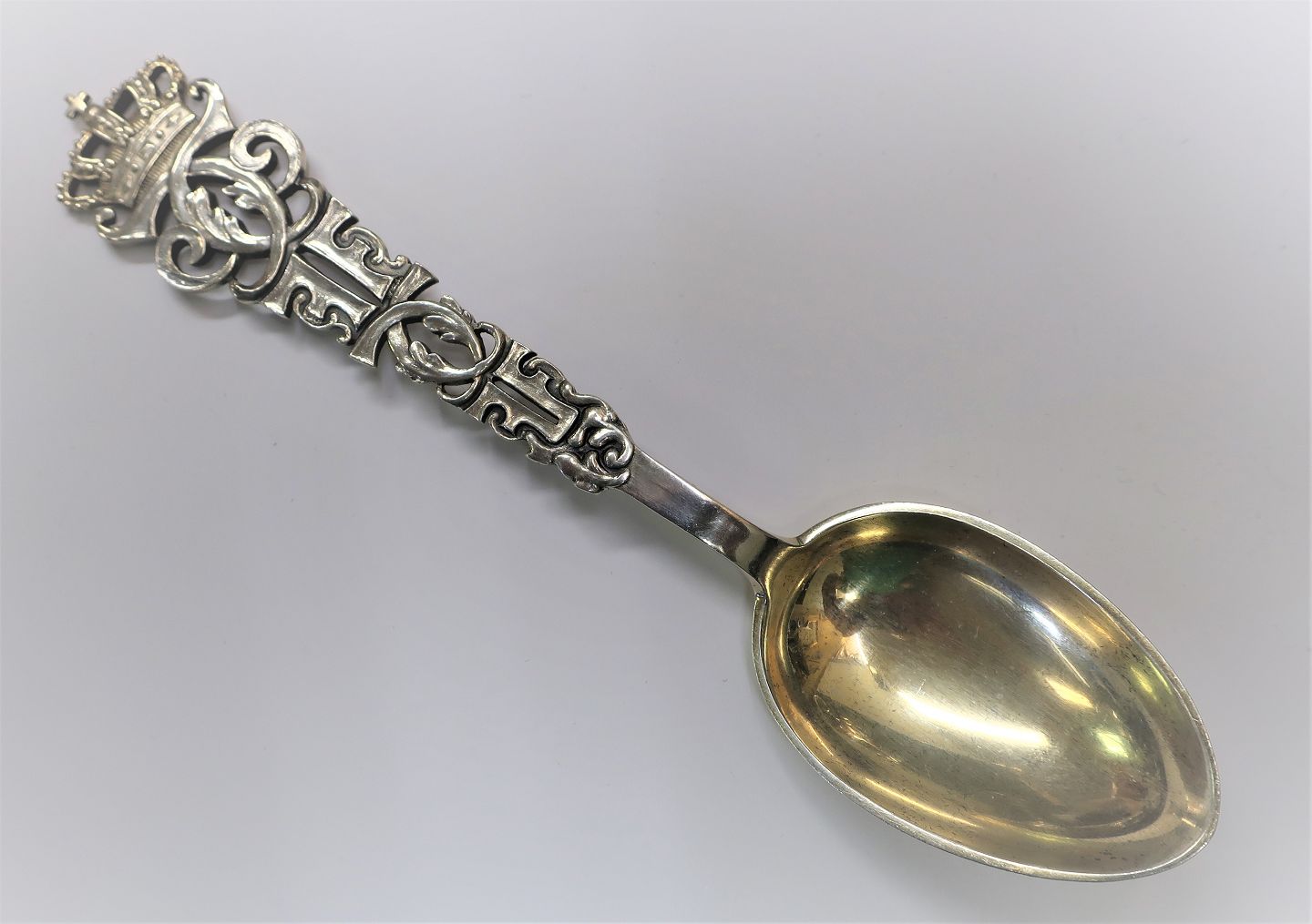 Michelsen. Sølv (925). Mindeske. Fir kongeske 1899. Ske. Længde 15,5 cm.