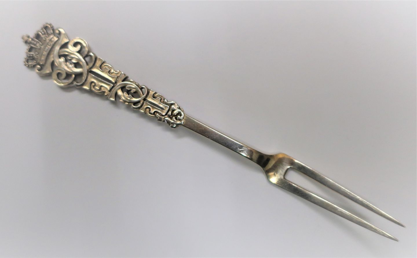 Michelsen. Fir kongeske mønster. Stegegaffel. Længde 15,5 cm. Produceret 1905.