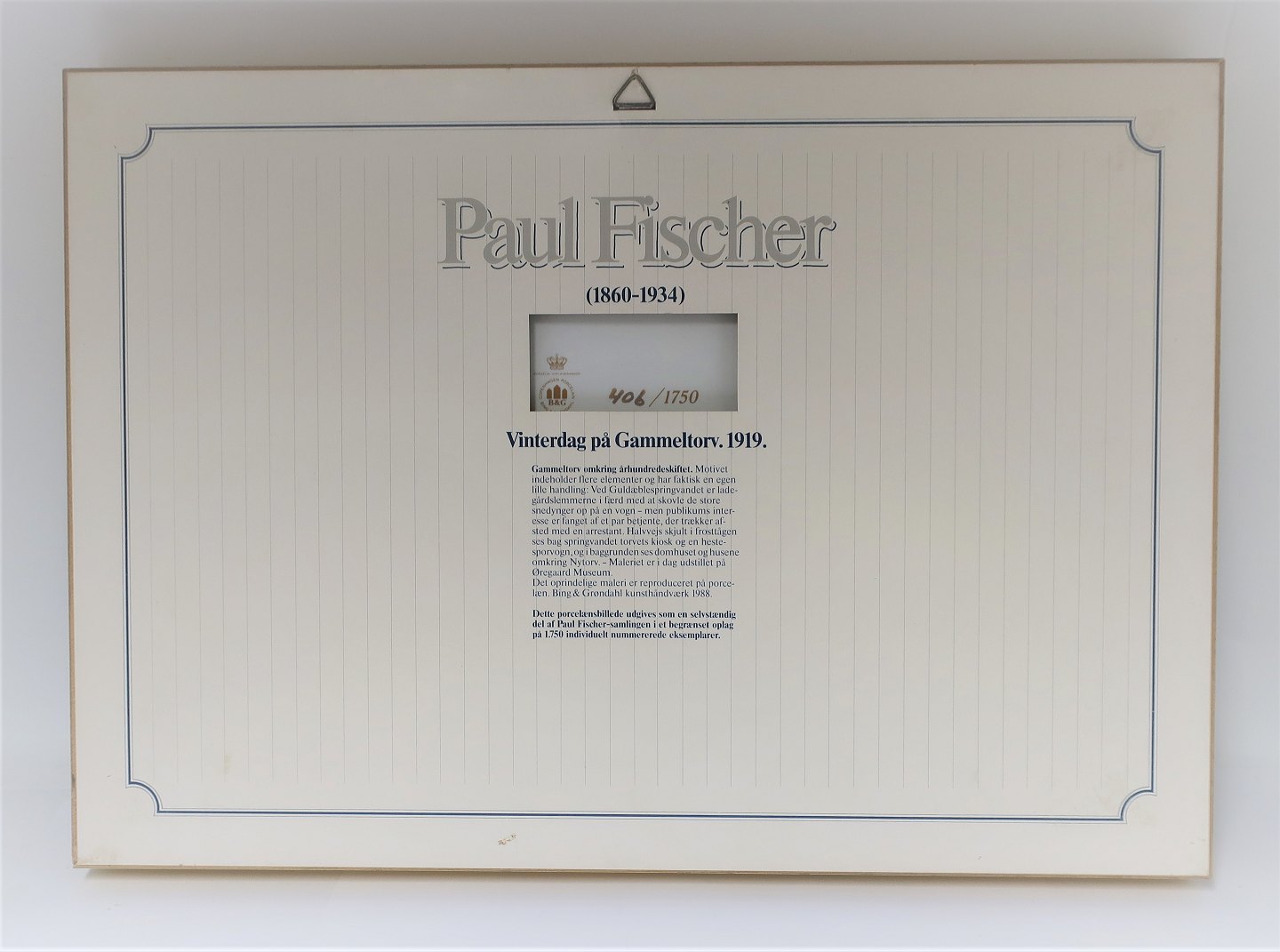 Bing & Grondahl. Porcelain painting. Motif by Paul Fischer. Winter day at Gammeltorv. Size inclusive frame, 47 * 33 cm. Produced 1750 pieces. This has number 406.