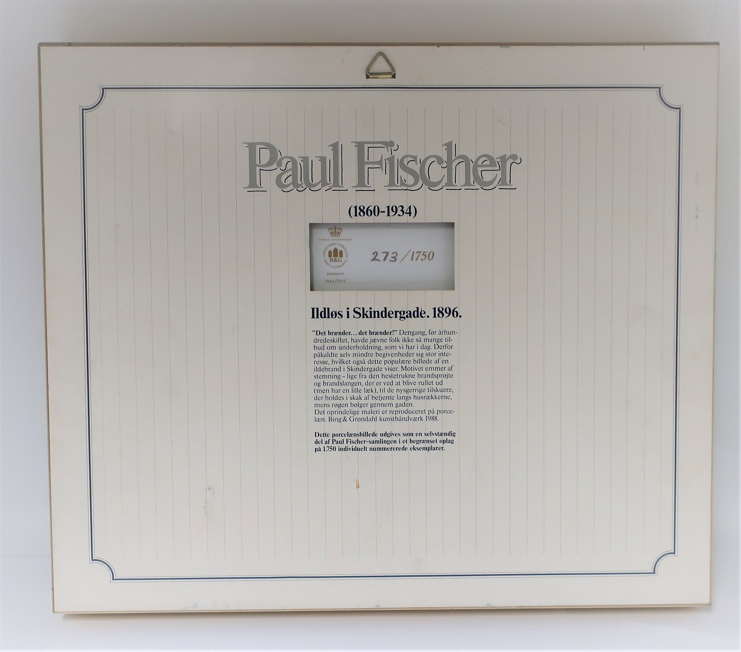 Bing & Grondahl. Porcelain painting. Motif by Paul Fischer. Fire in Skindergade. Size inclusive frame, 40 * 33 cm. Produced 1750 pieces. This has number 273.