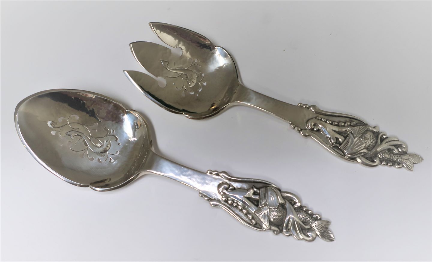 Emil Hansen, Odense. Fiske serveringssæt. Sølvbestik (830). Længde 24,5 cm. Kraftig kvalitet.