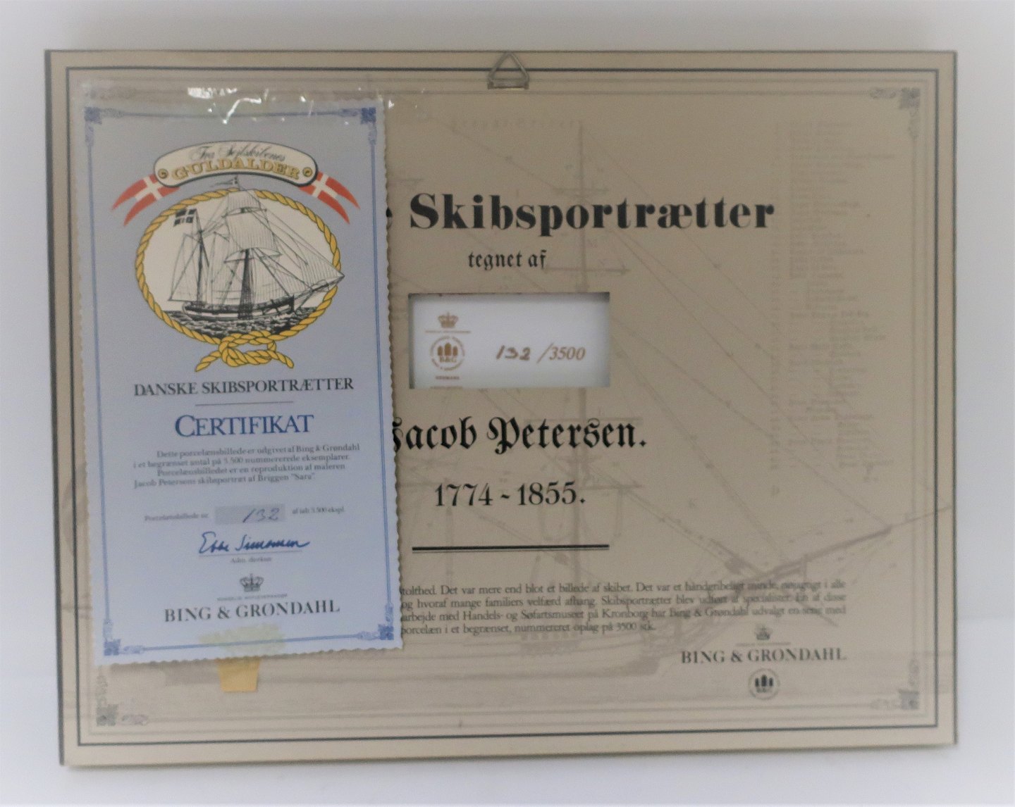 Bing & Grondahl. Porcelain. Danish ship portraits. Picture of Briggen "Sara". Dimensions: Width 38 * 30 cm. 3500 have been produced and this is no. 132.