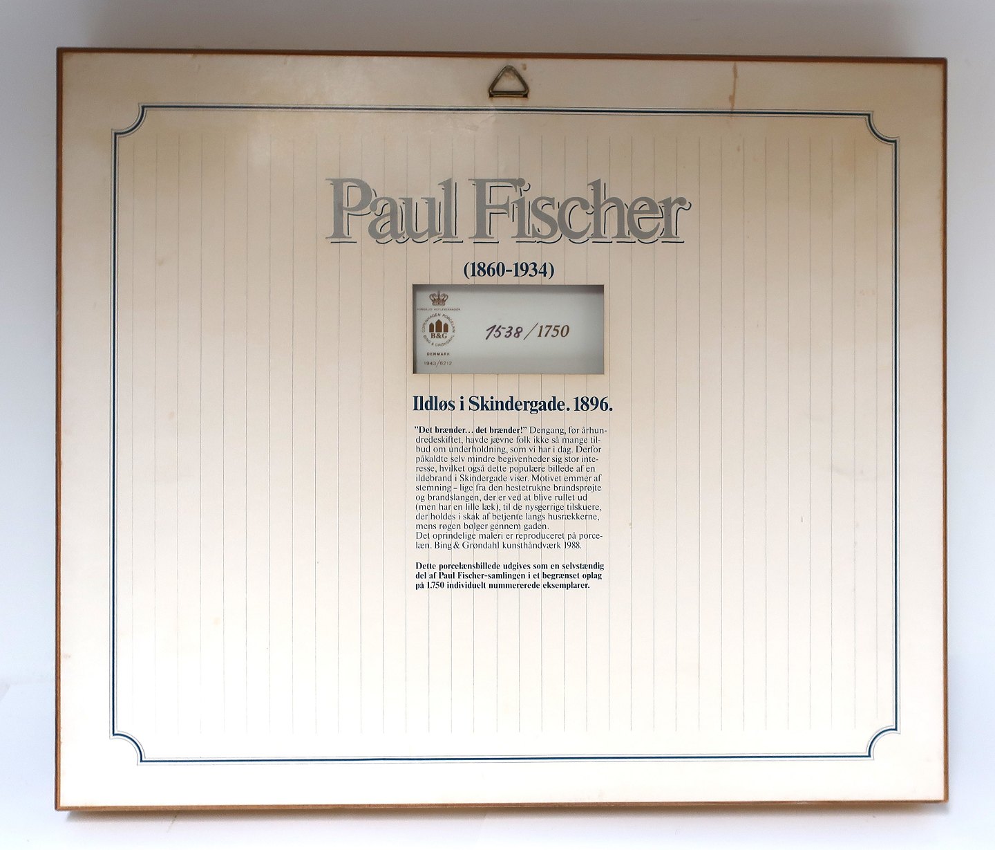 Bing & Grondahl. Porcelain painting. Motif by Paul Fischer. Fire in Skindergade. Size inclusive frame, 40 * 33 cm. Produced 1750 pieces. This has number 1538.