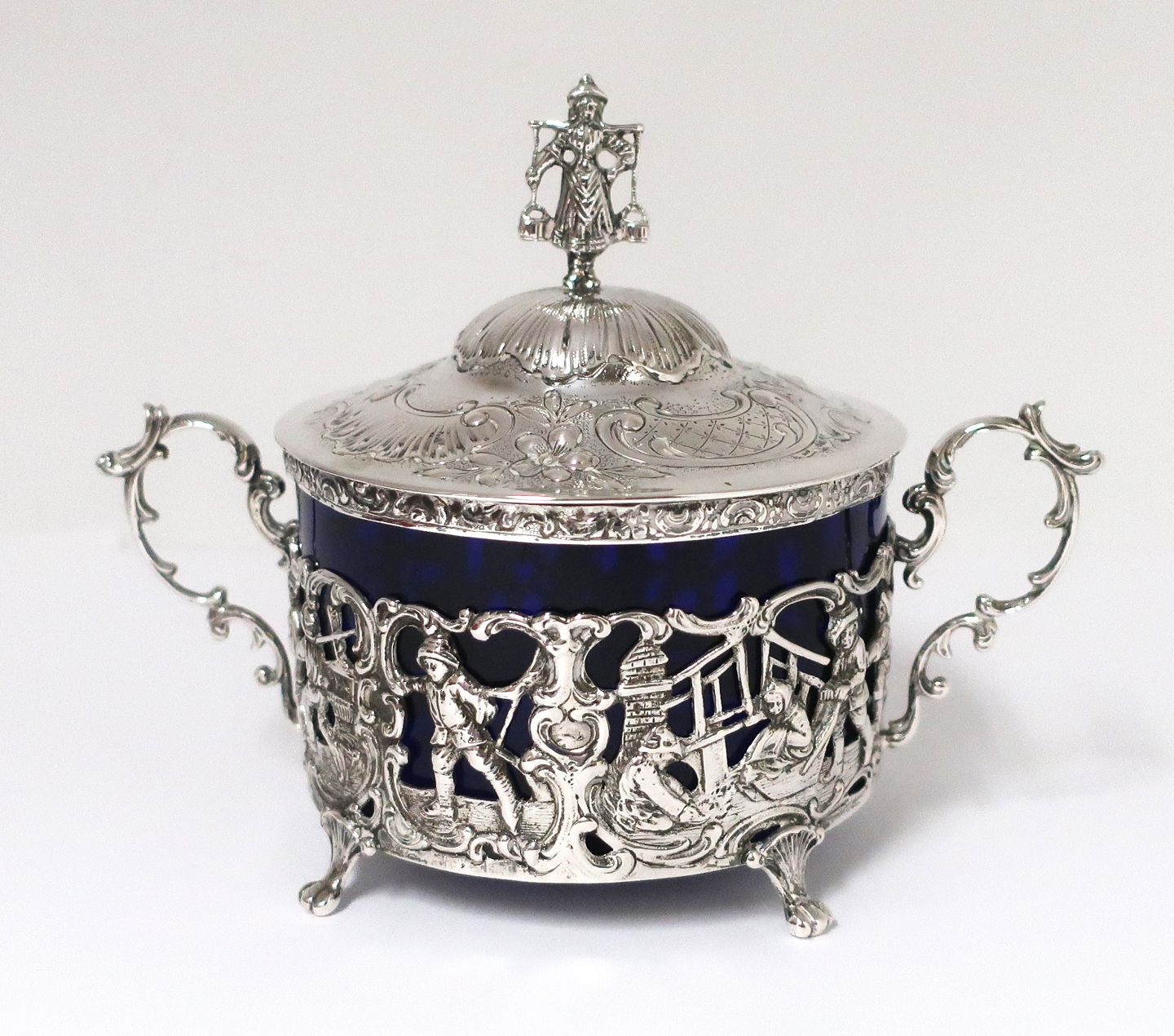 Sukkerskål med blåt glas og sølvmontering (800). Diameter 9 cm.