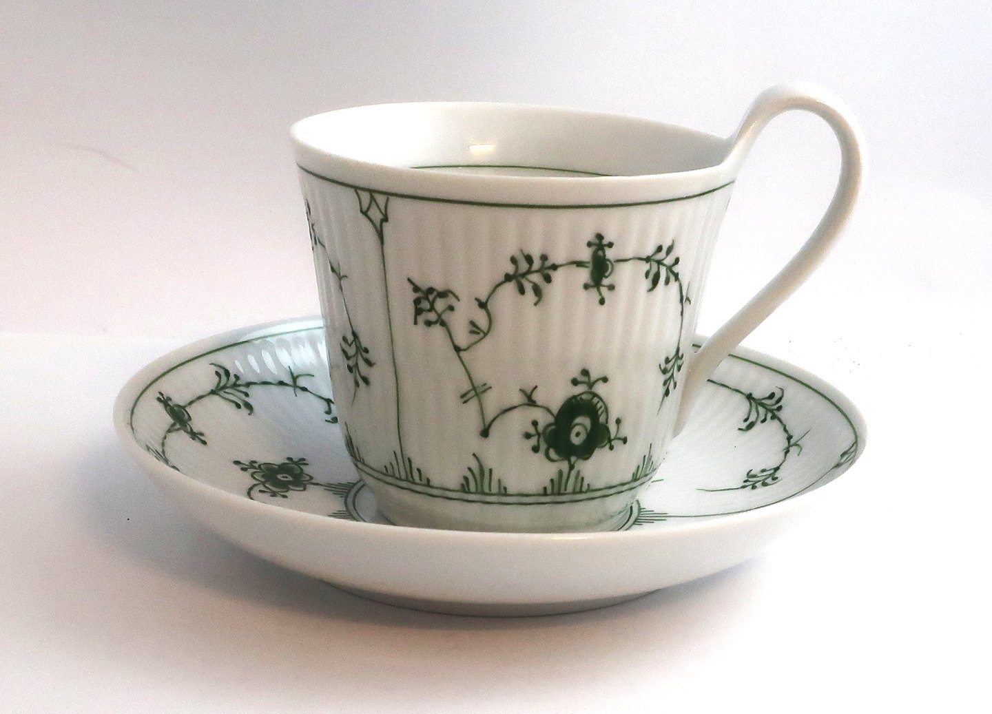 Royal Copenhagen. GRØN musselmalet. Morgenkop med høj hank og kagetallerken. Kop 093 og tallerken 620 (19 cm). (2 sortering)