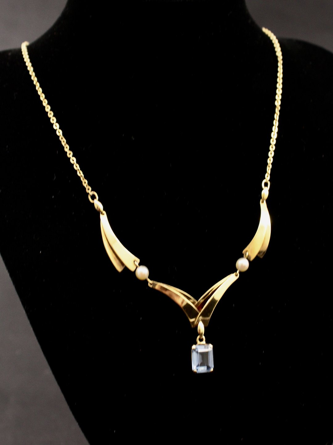 14 karat guld halskæde 48 cm. med perler og aquamarin fra juveler Herman Siersbøl emne nr. 507497