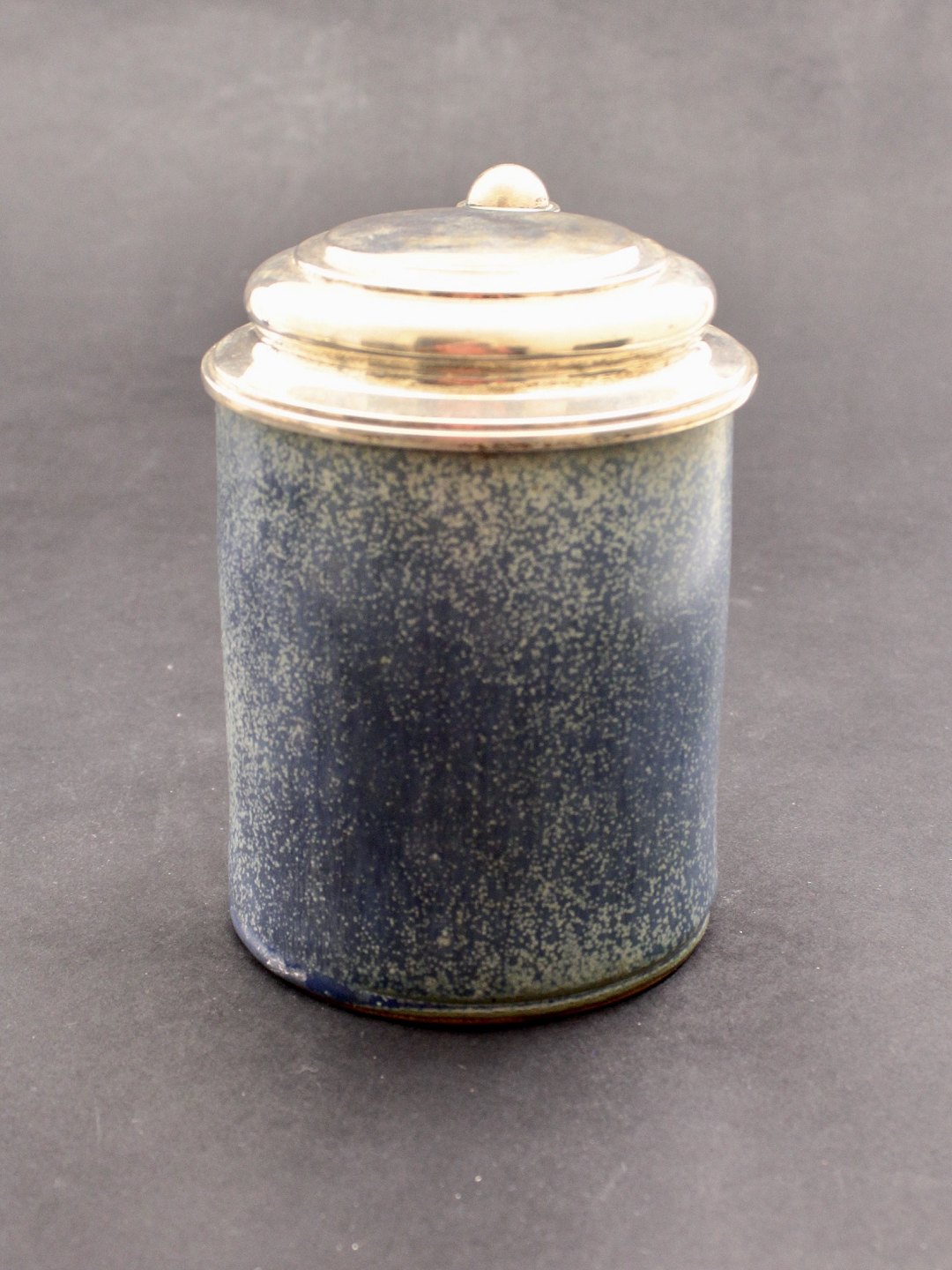 Arne Bang ceramic mug with silver lid H. 14 cm. blue mottled glaze item no. 510152