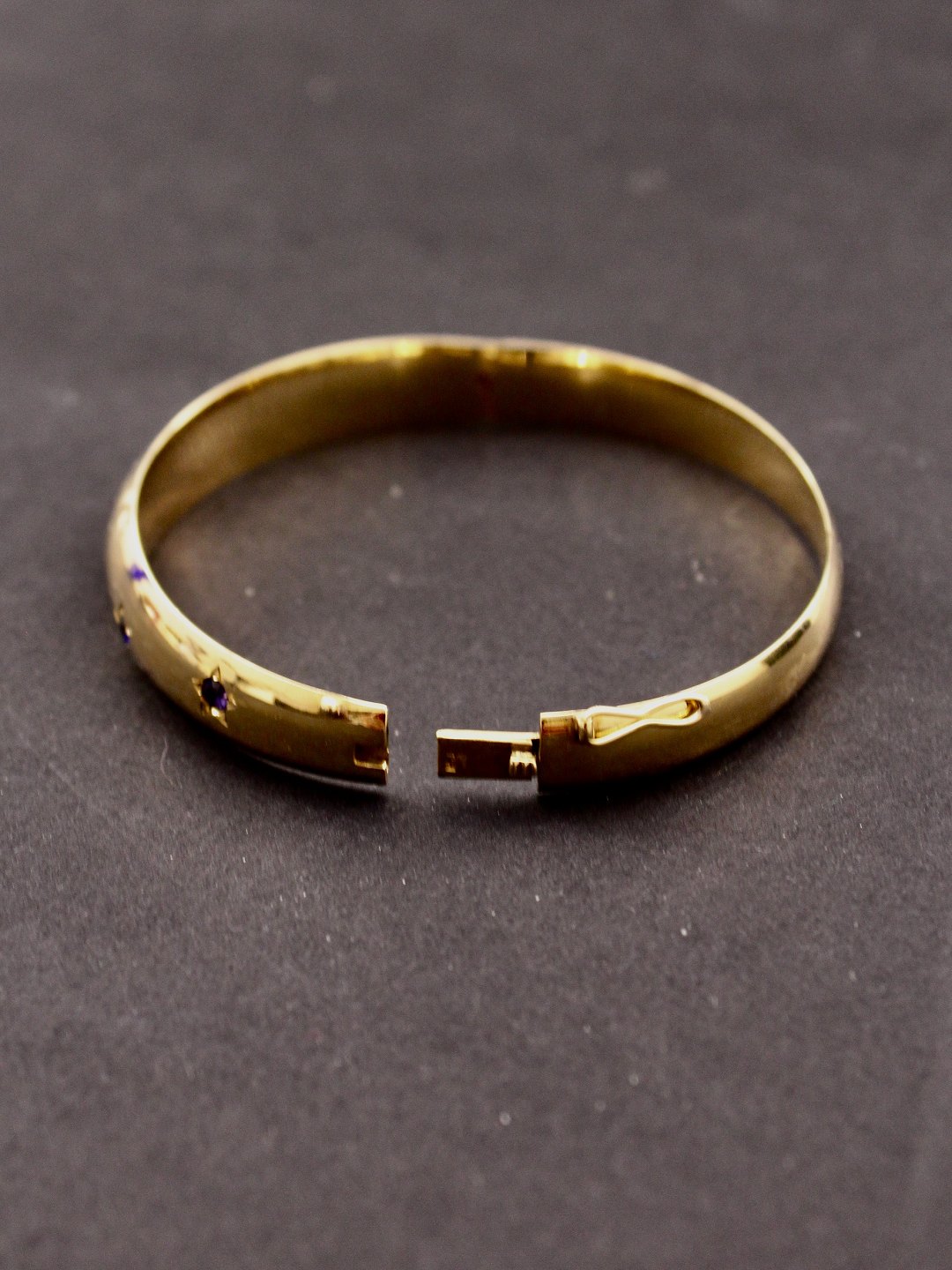 14 karat guld armring med ametyster indvendig mål 6,4 x 5,6 cm. B. 1,1 cm. fra guldsmed Hans Jensen København emne nr. 569575