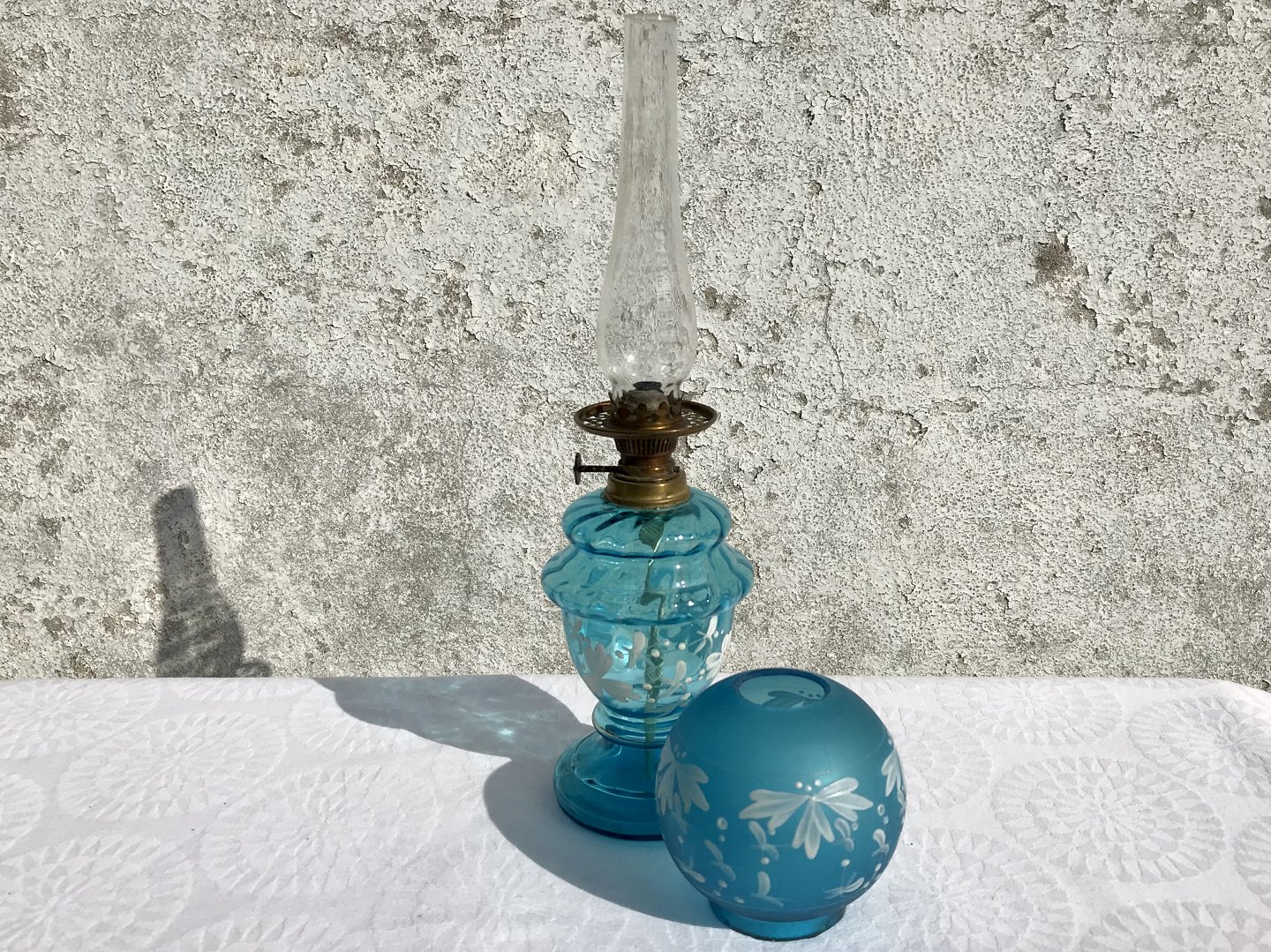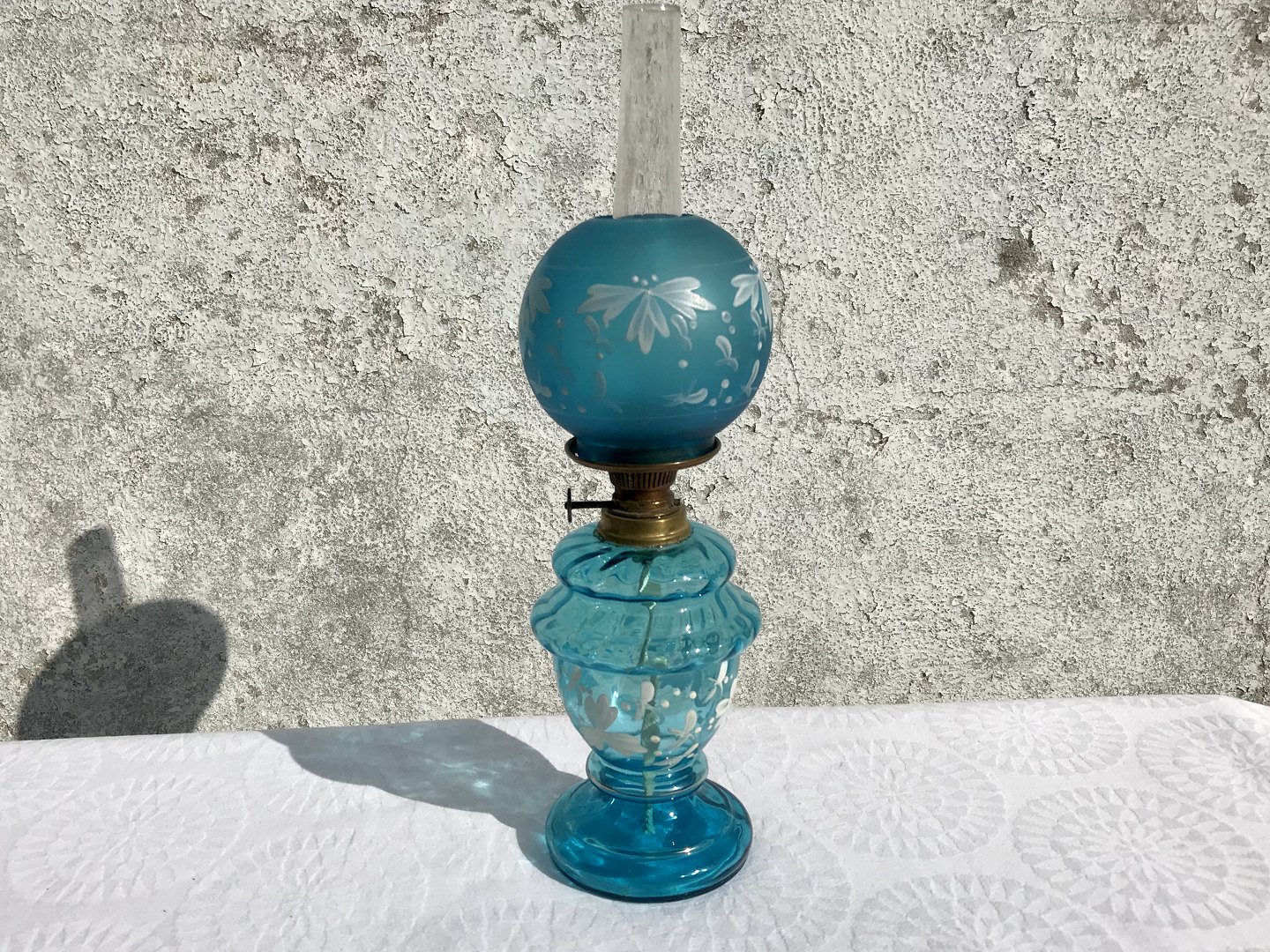 Oil lamp, Blue glass with painted flower motif, 29cm high * Nice condition *