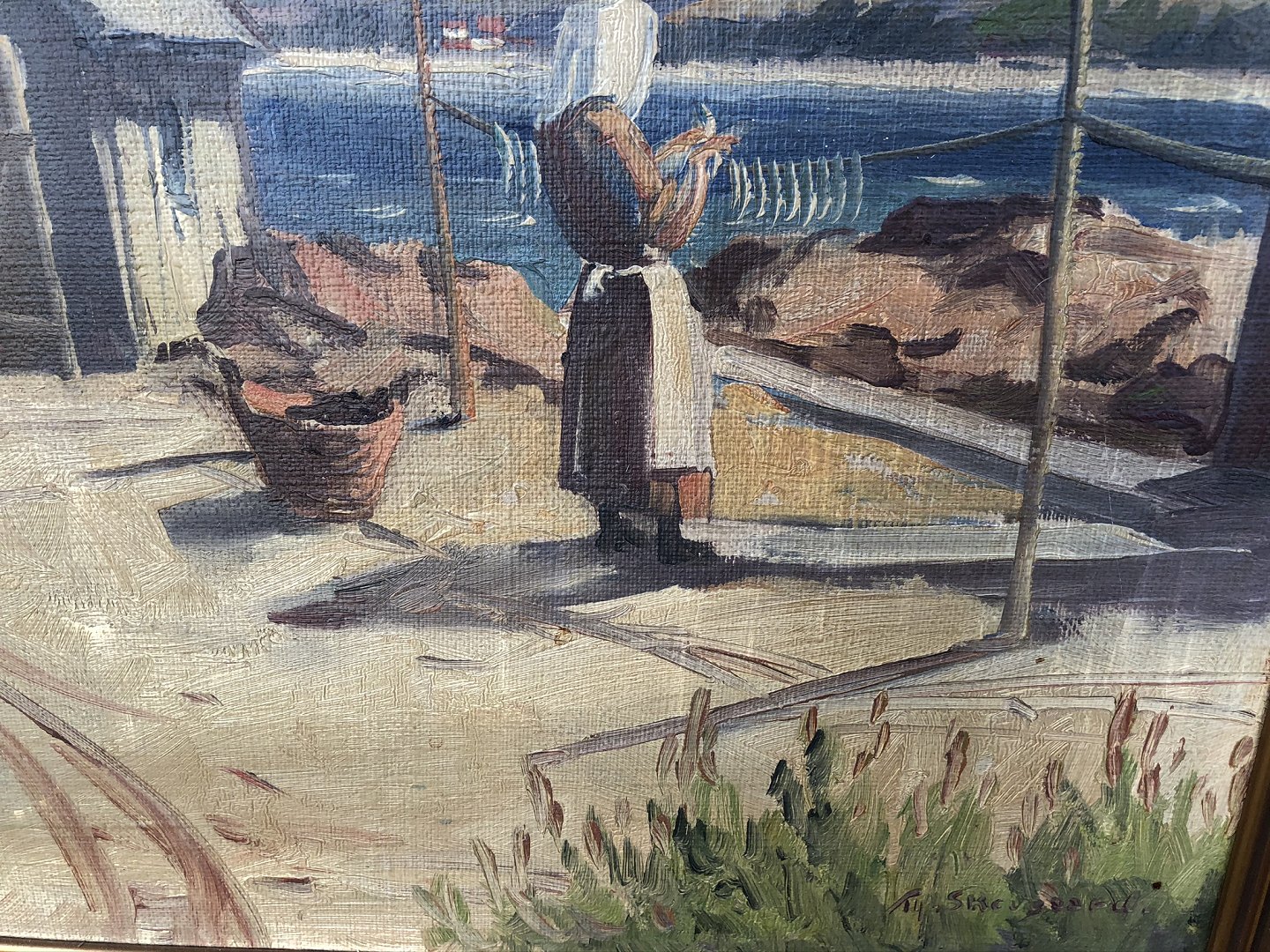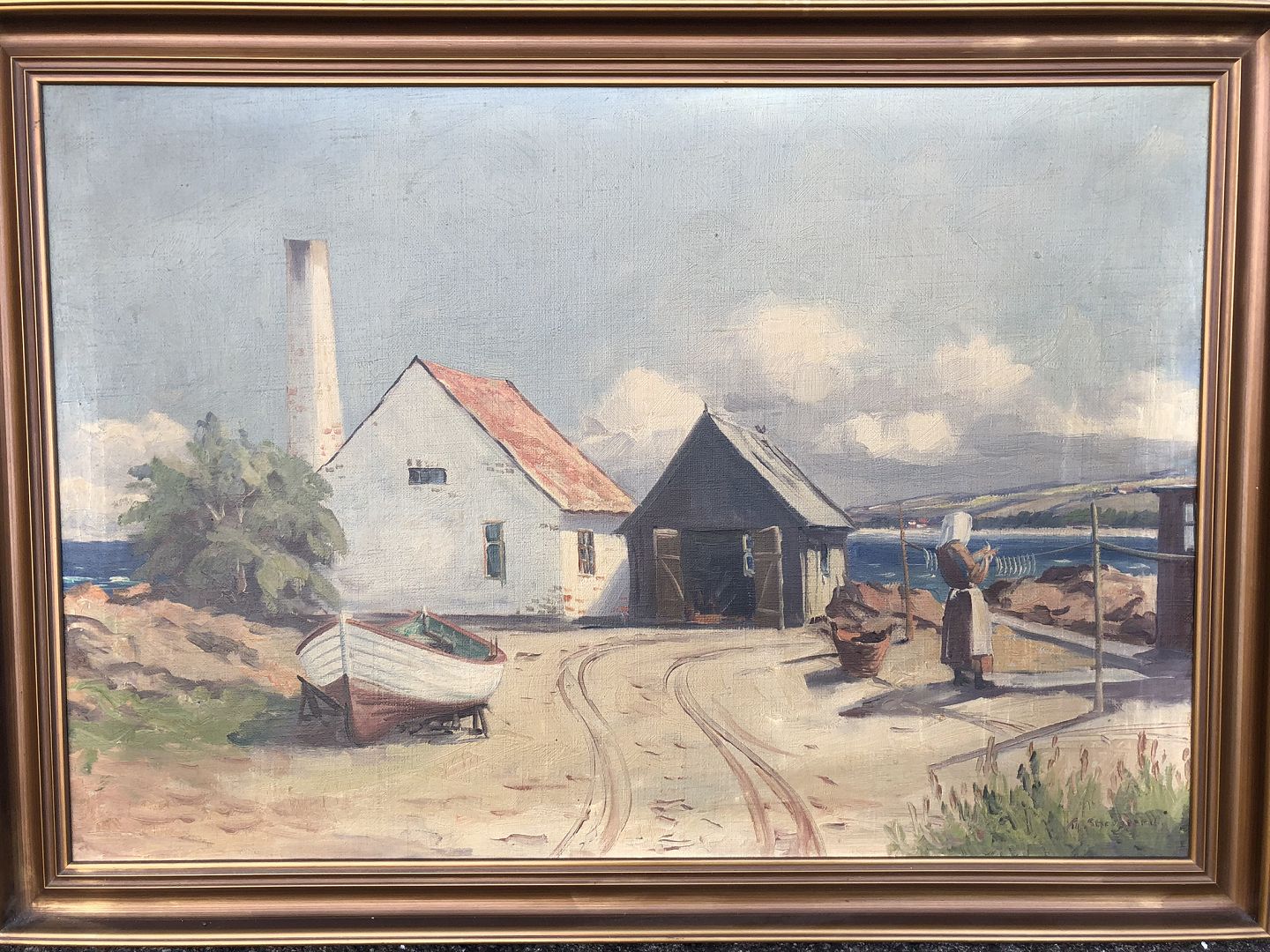 Theodor Skovgaard. Motif with fish wife to dry fish, probably from Bornholm. 63x93 cm, with frame 76x106 cm.