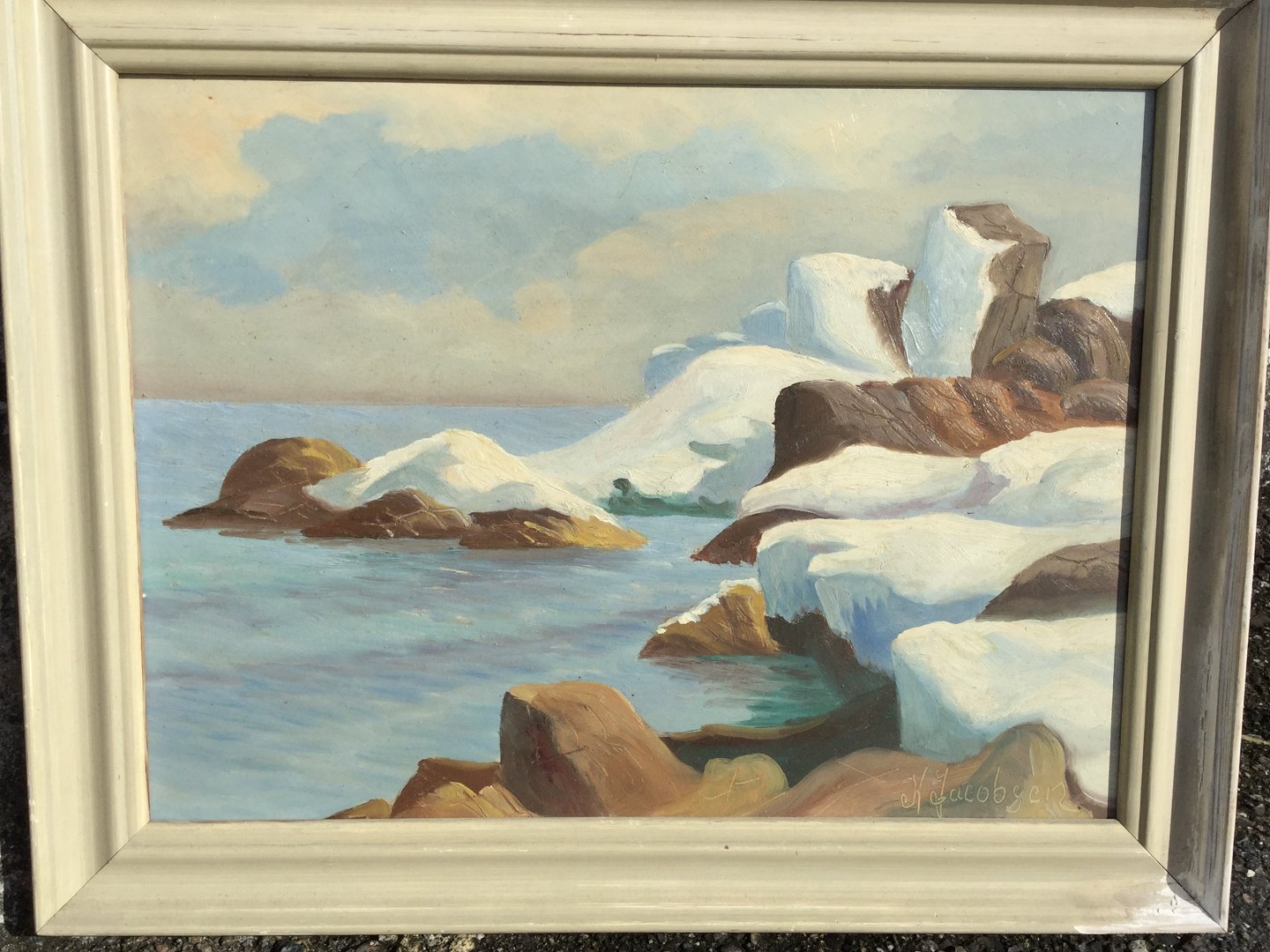 K. Jacobsen, Greenland motif. Oil painting on plate. Some peeling on the frame (see photo). Dimensions: 28x38, with frame: 36x46