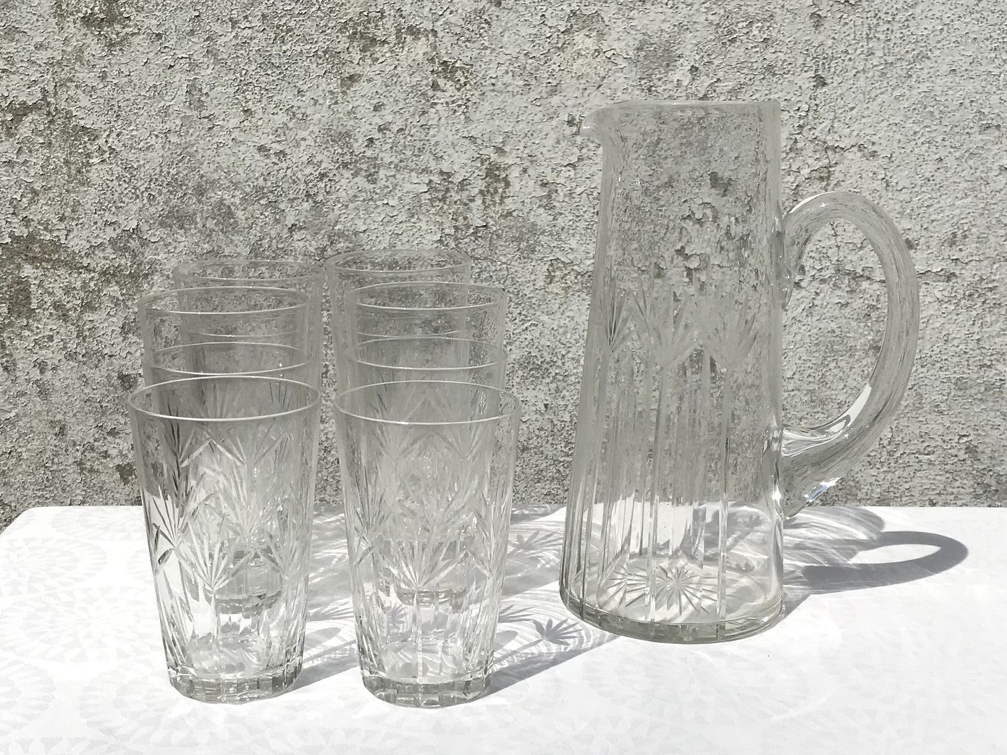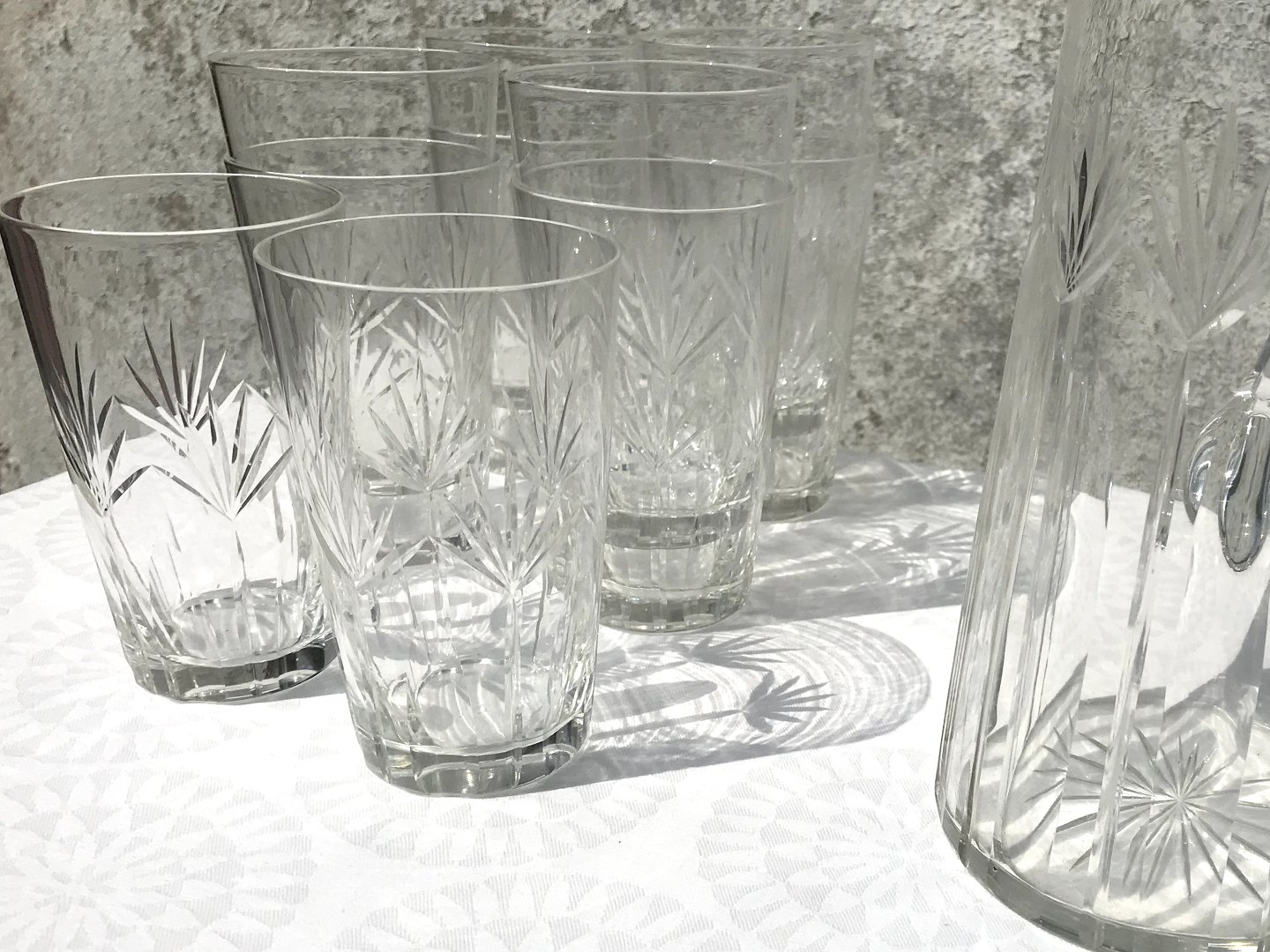 Juice set, jug and glass with flower grinders, Jug 23cm high, 10cm in diameter, 10 glasses 12cm high, 7.3cm in diameter * Perfect condition *
