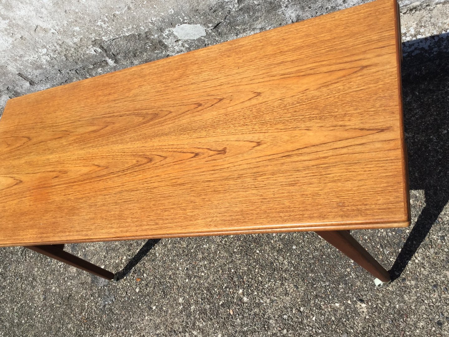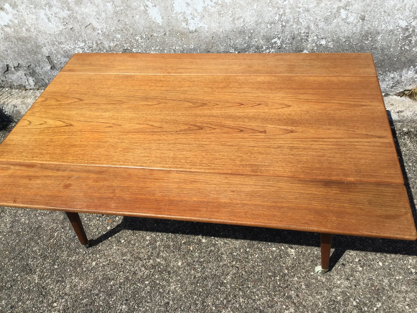 Coffee table / Dining table with raising / lowering function and extension in the sides. Teak veneer, Danish modern from the 1960s. Height dining table 75 cm, height coffee table 60 cm. Length 135 cm, Width 55 cm (folded out 91cm). Nice used condition.