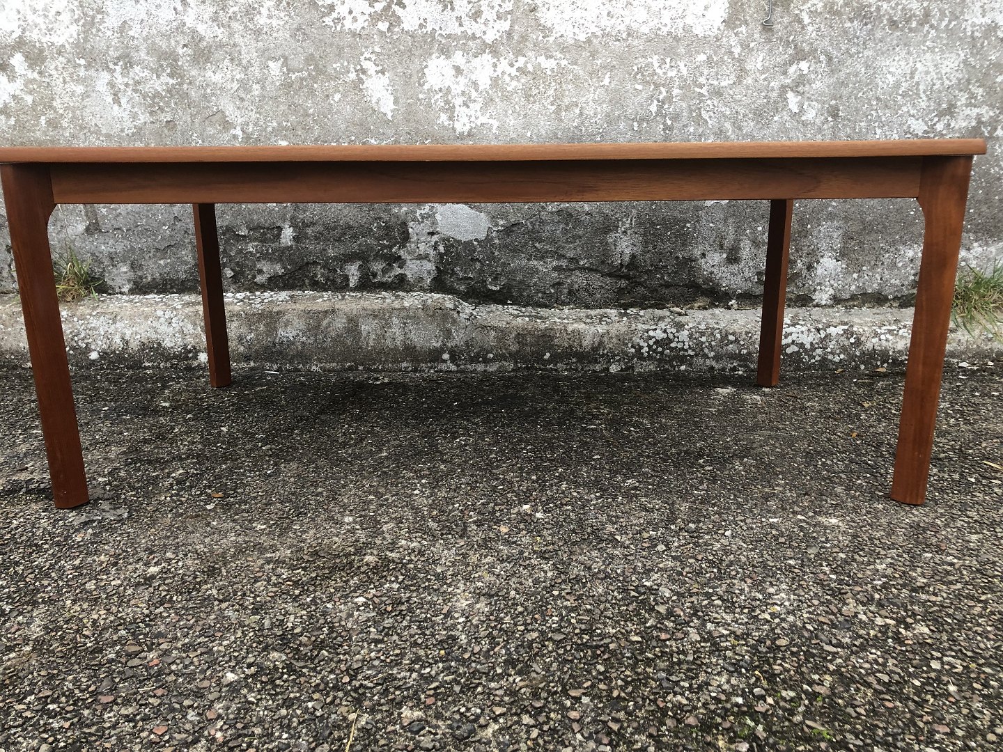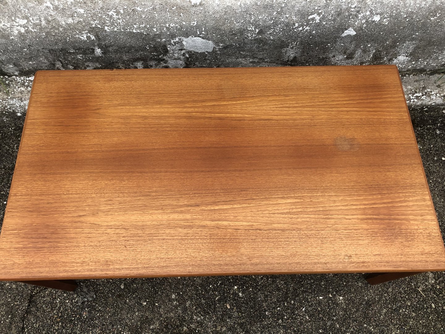 Coffee table in teak veneer with solid teak legs. Stamped: Møbelfabrikken "Toften" Made in Denmark. Danish modern from the 1960s. Dimensions HxLxW 49x124x70 cm. with a slight trace of use.
