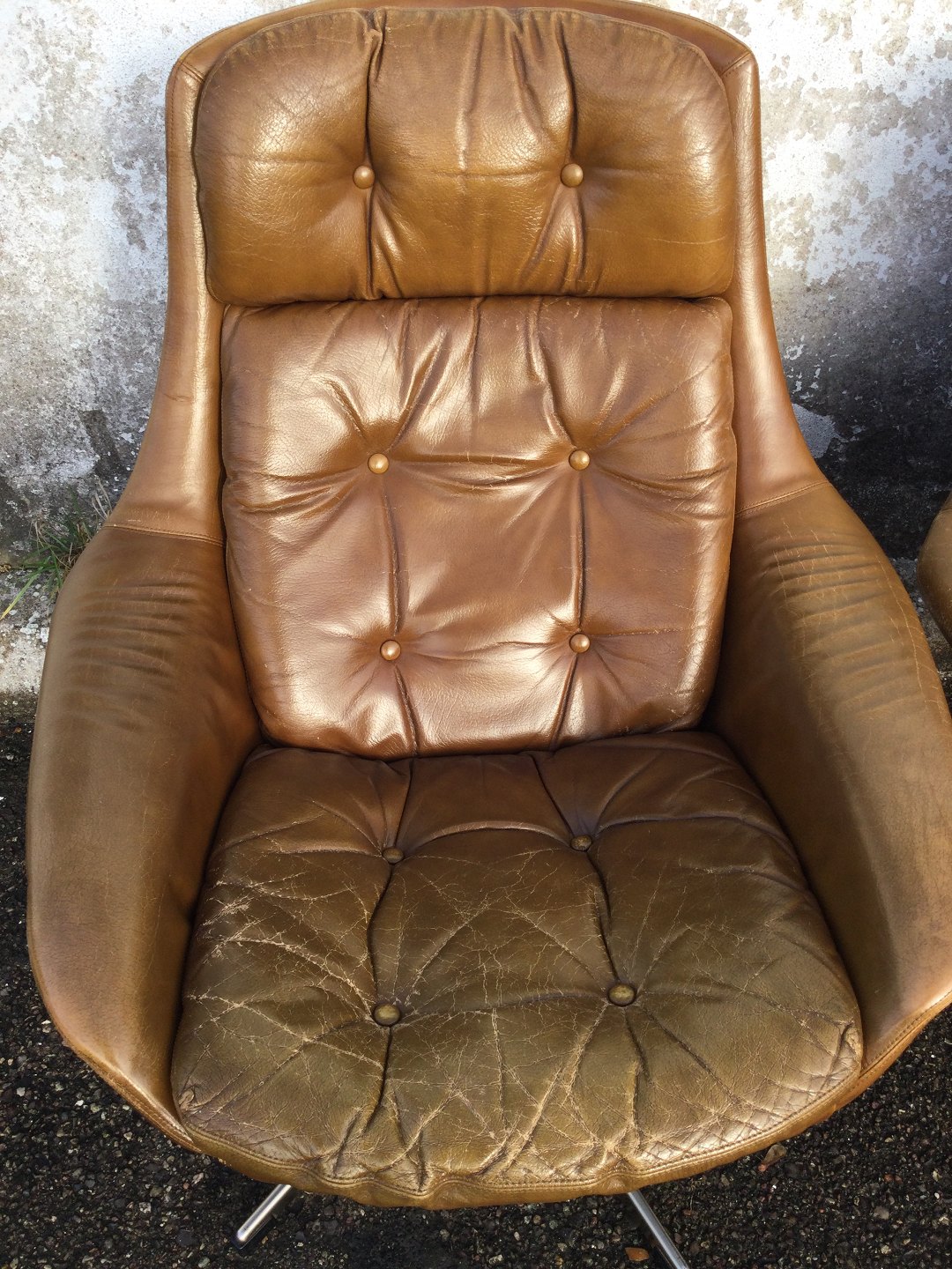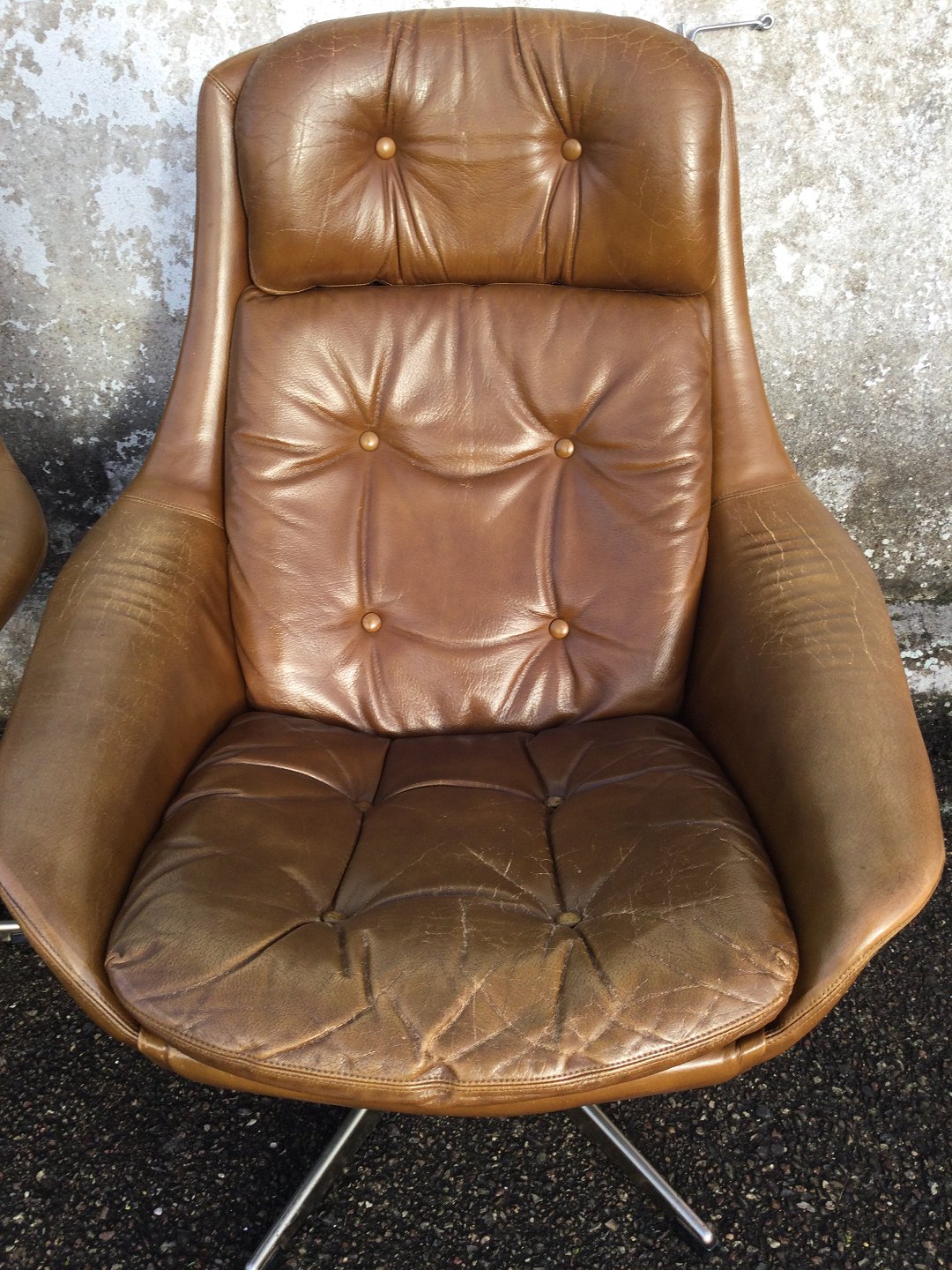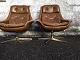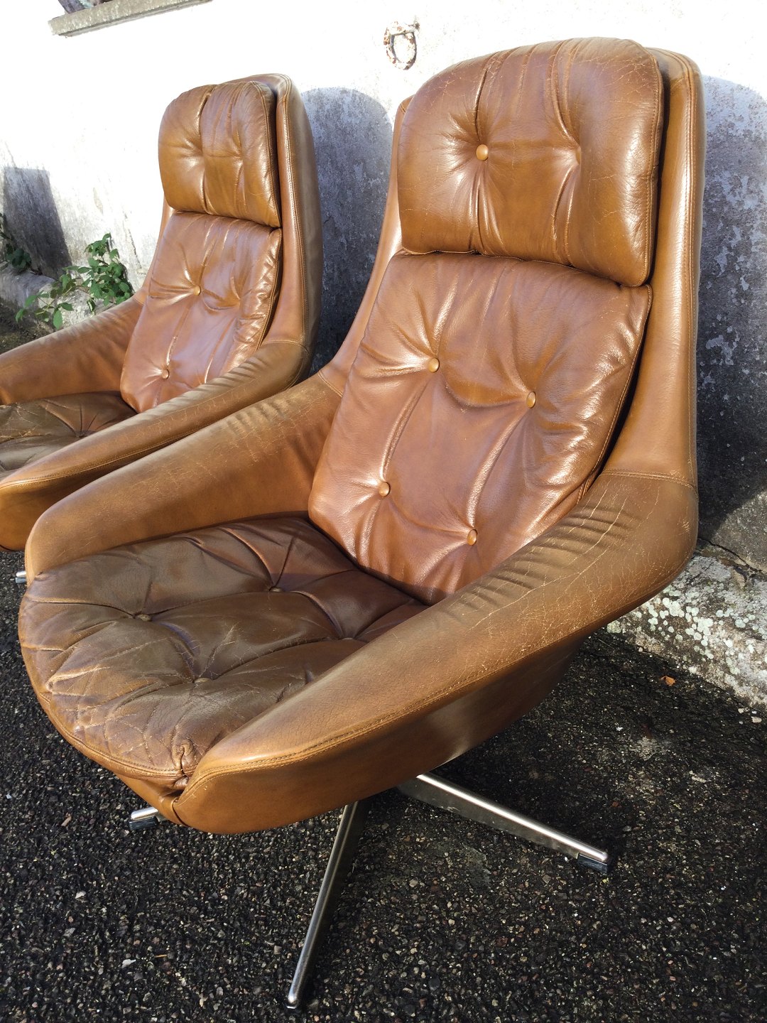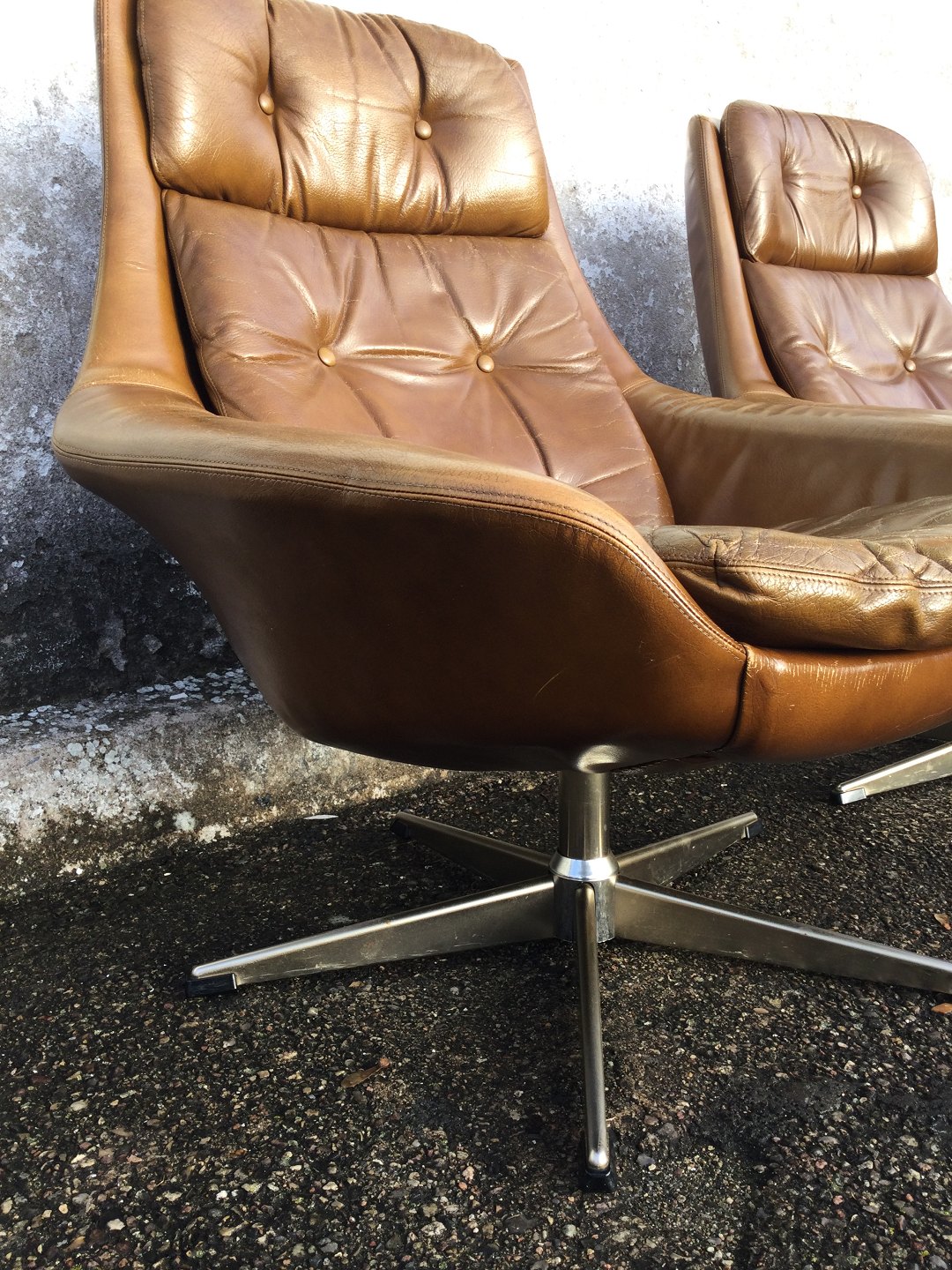 Lystolet, two armchairs in patinated leather on a metal swivel base.
