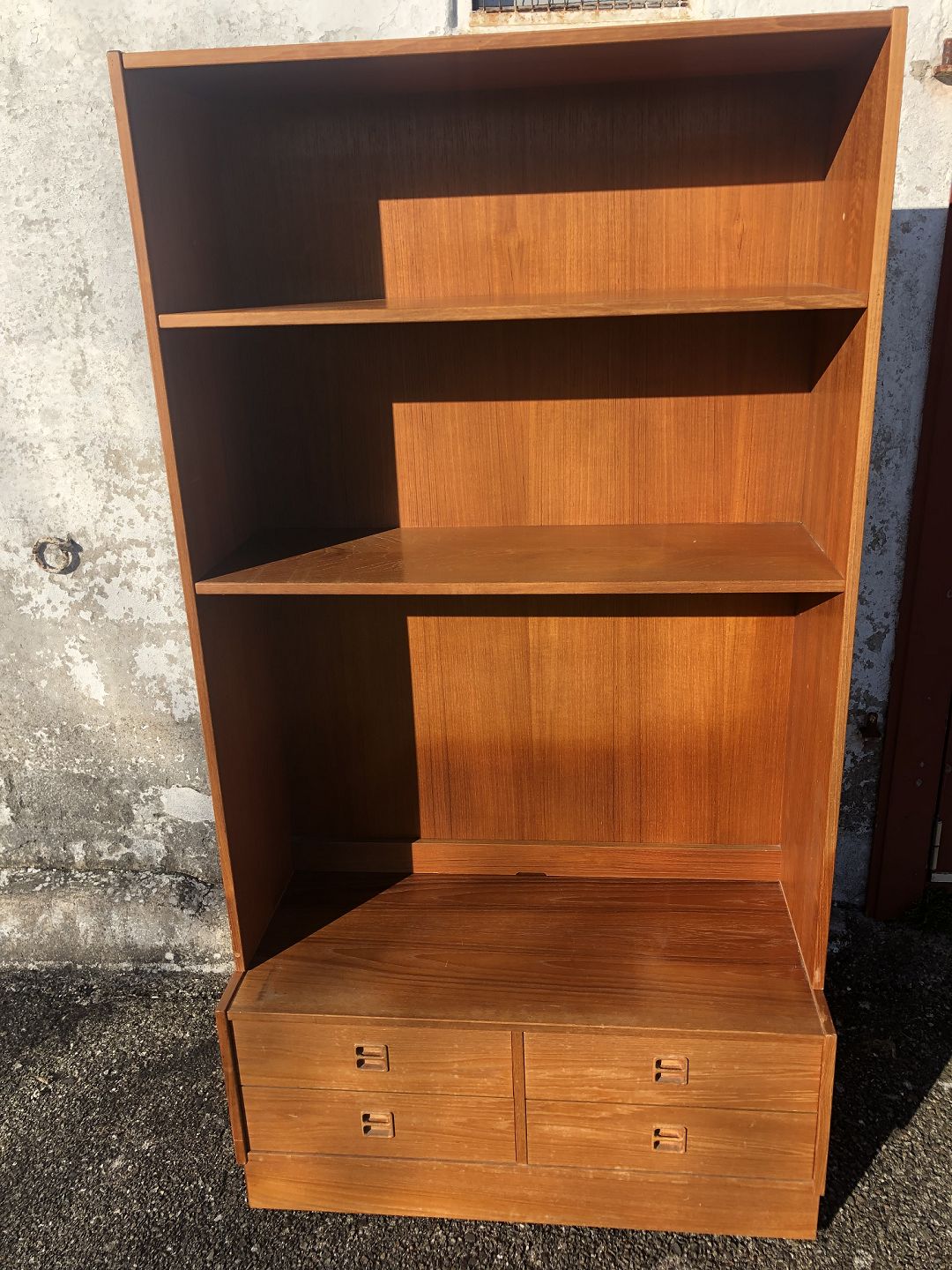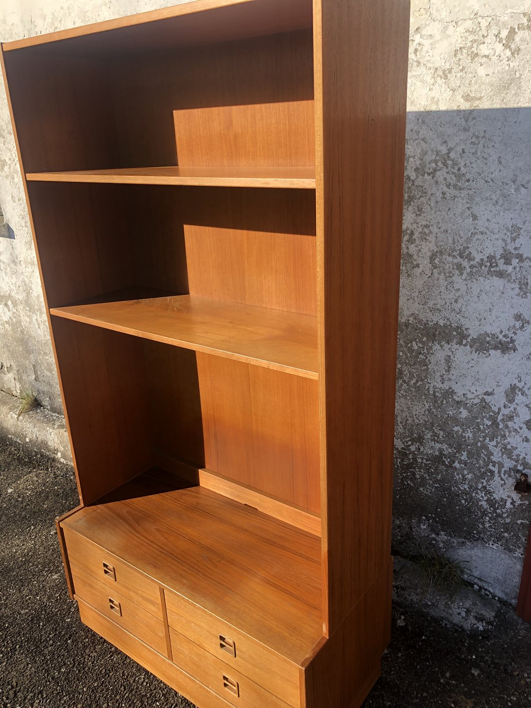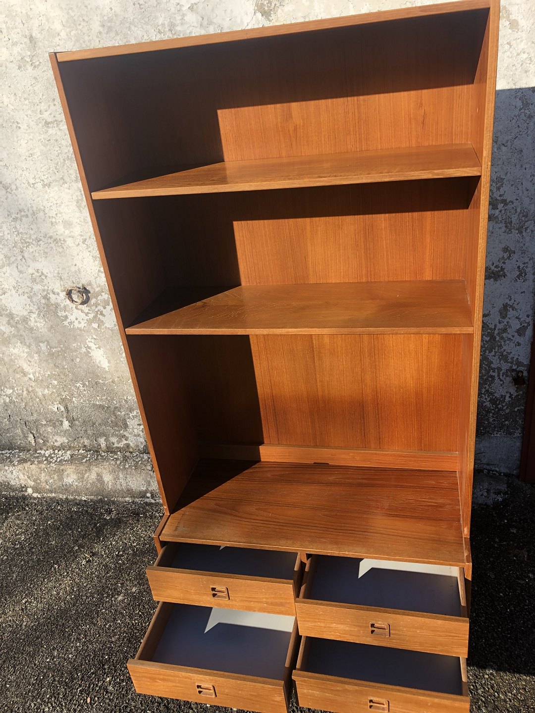 Bookcase in teak veneer with drawers below. Danish modern from the 1960s, manufactured by ÆJM-møbler A/S. Dimensions 167x111x50 cm. Has a few holes in the back covering.