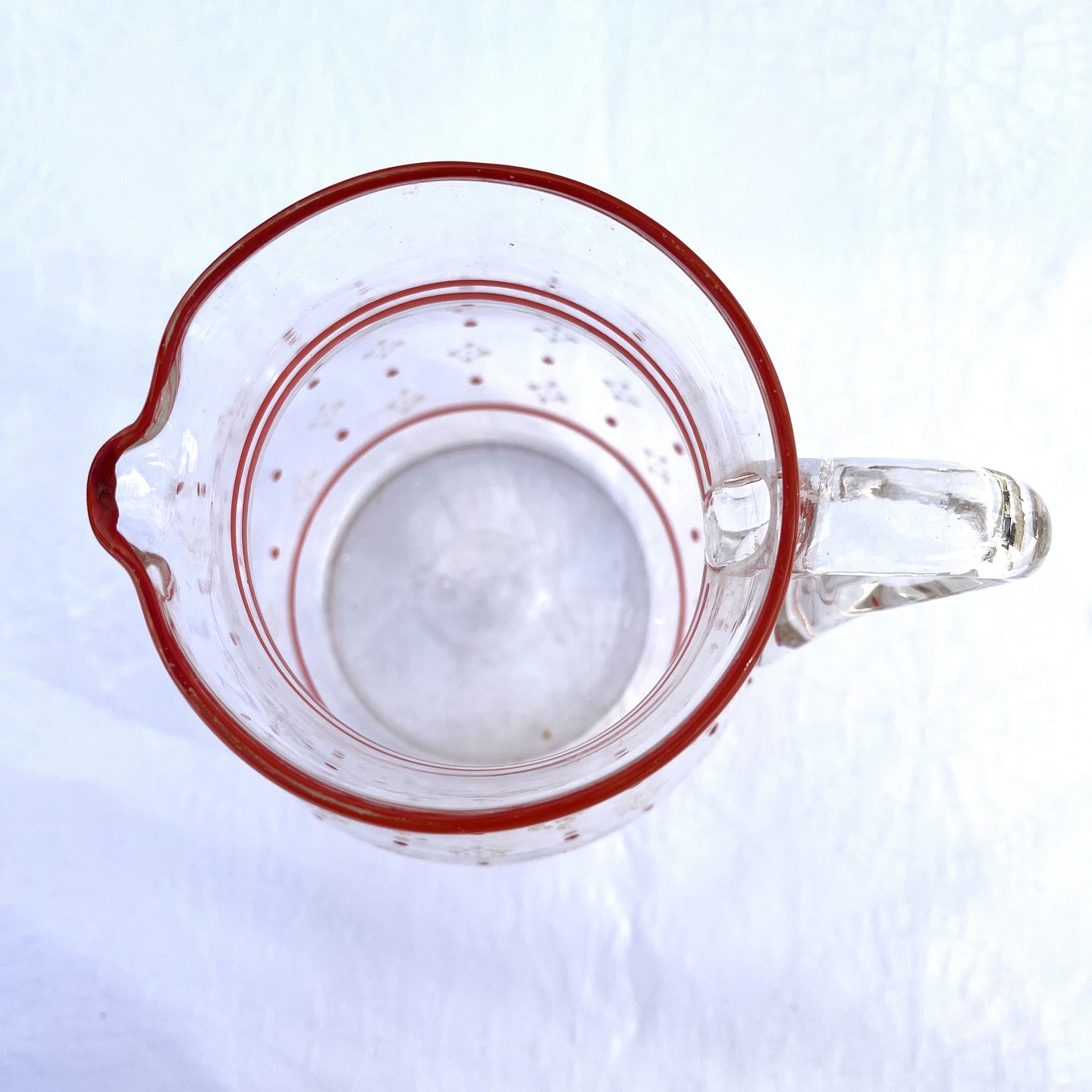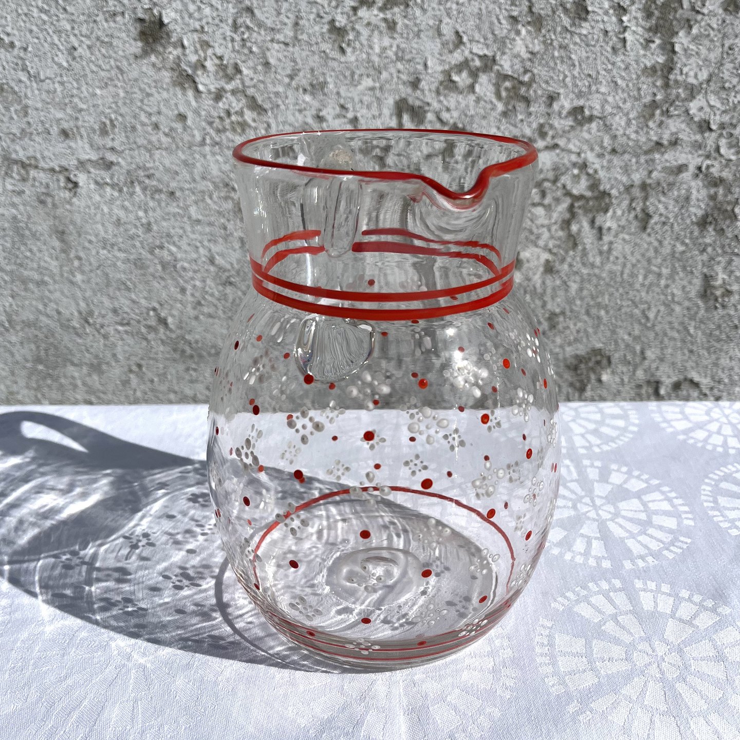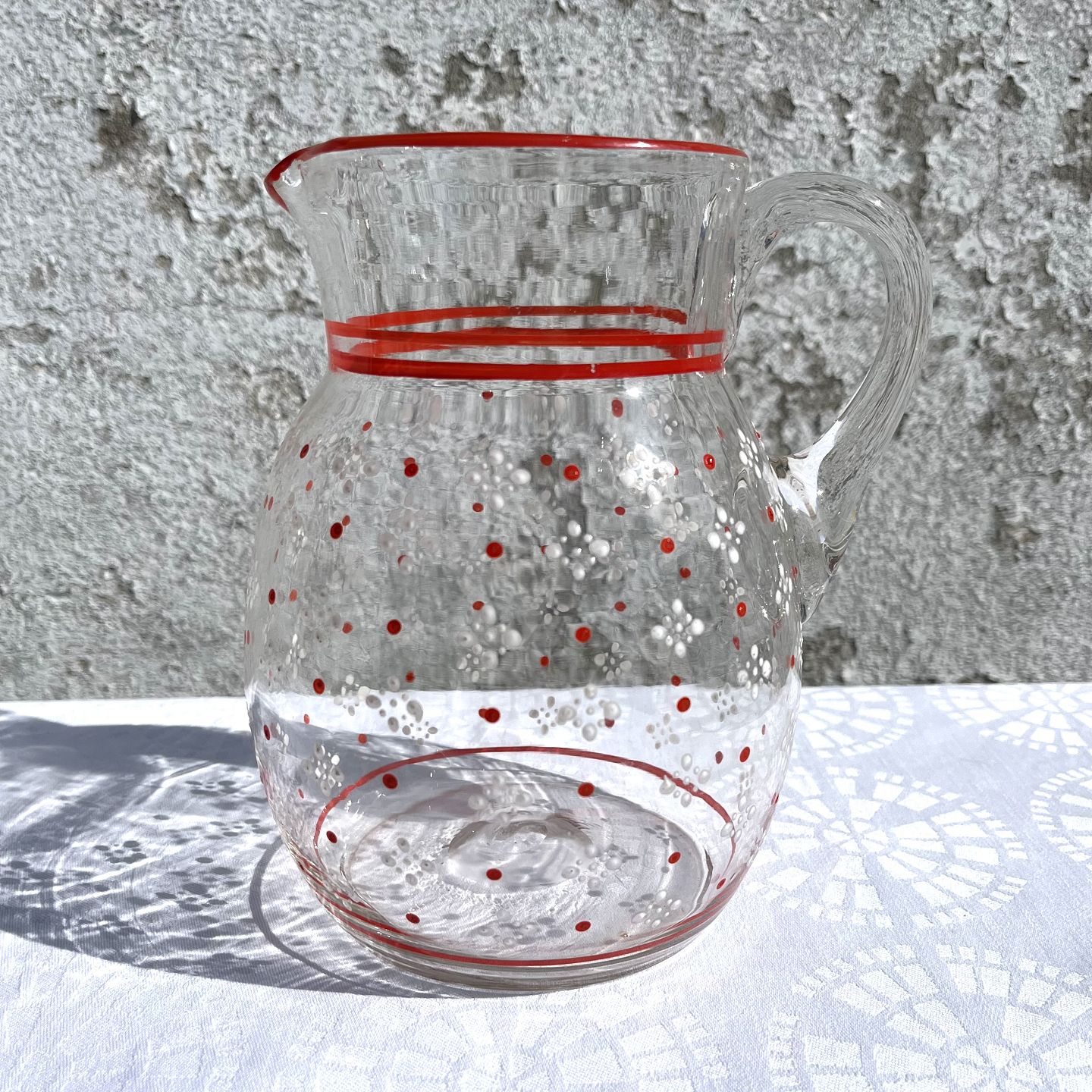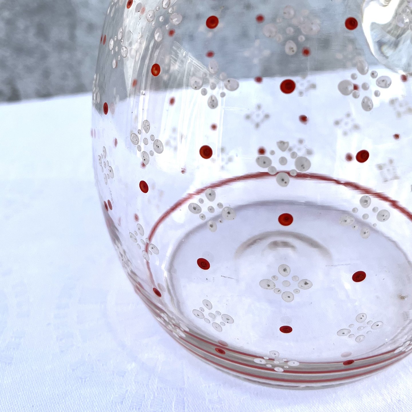 Glass jug, With enamel painted pattern in red and white, 18cm high, 15cm wide * Nice condition *