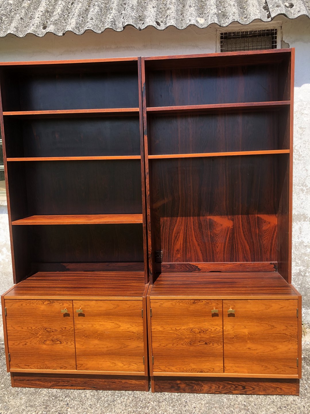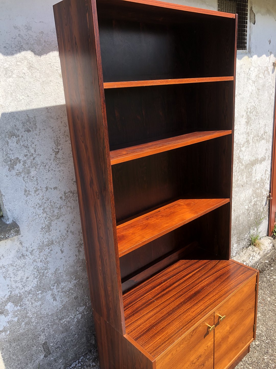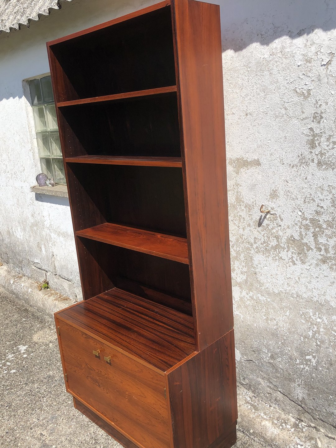 Bookcase with base cabinet in rosewood veneer. Danish modern from the 1960s. The top can be removed. Comes with utility tracks and 1 shelf module with hole for cables. Dimensions HxWxD 194x85x43 cm