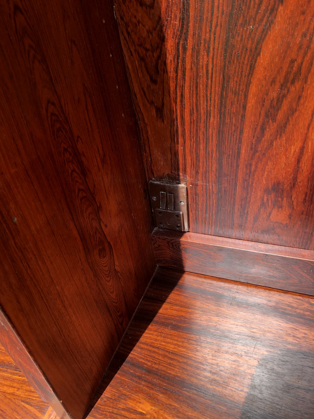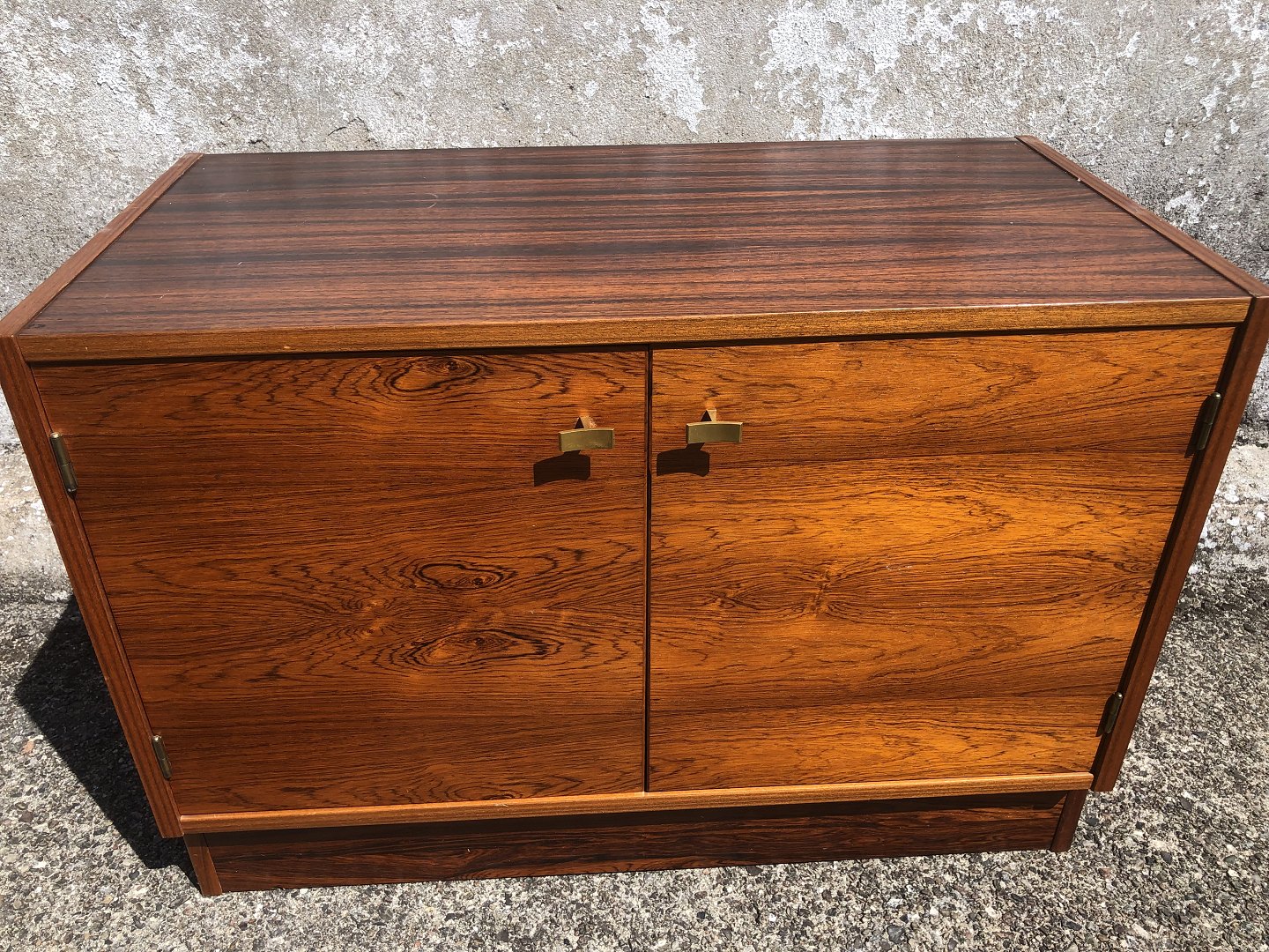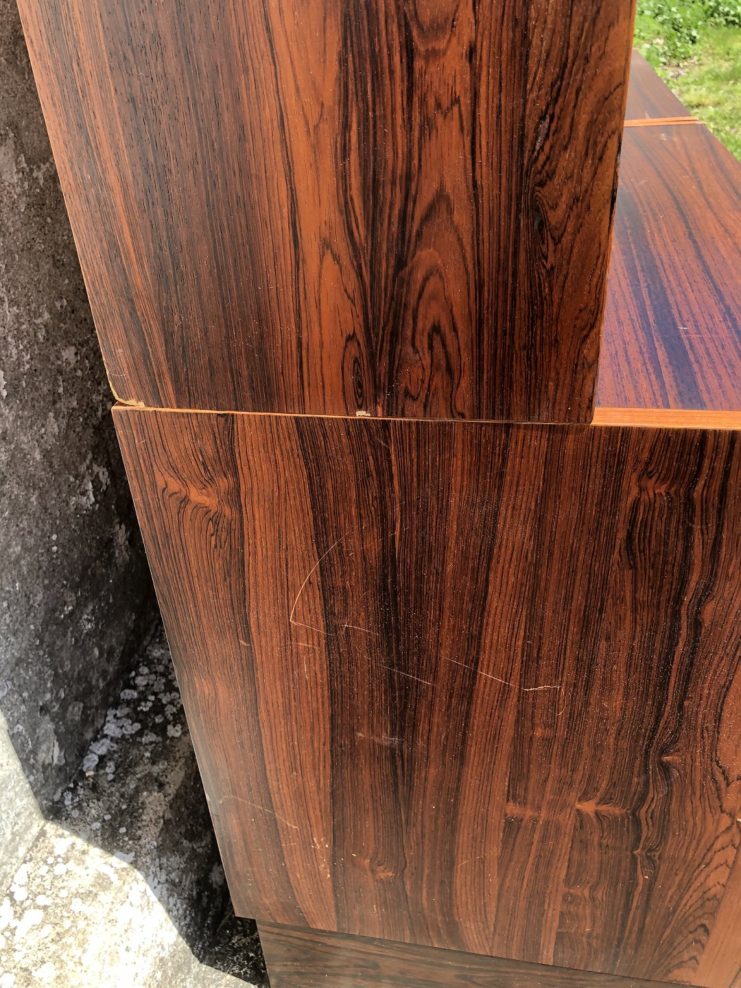 Bookcase with base cabinet in rosewood veneer. Danish modern from the 1960s. The top can be removed. Comes with utility tracks and 1 shelf module with hole for cables. Dimensions HxWxD 194x85x43 cm
