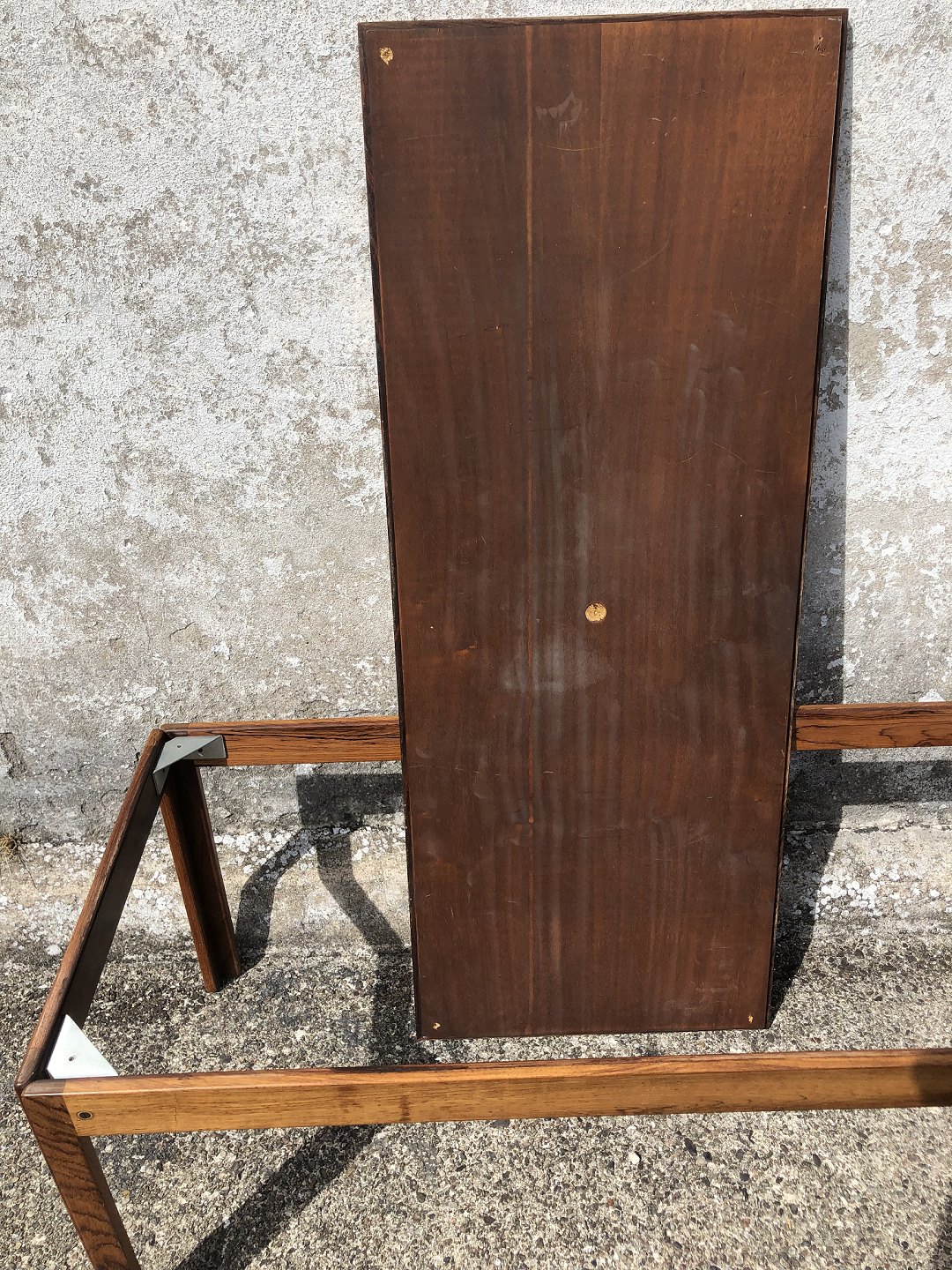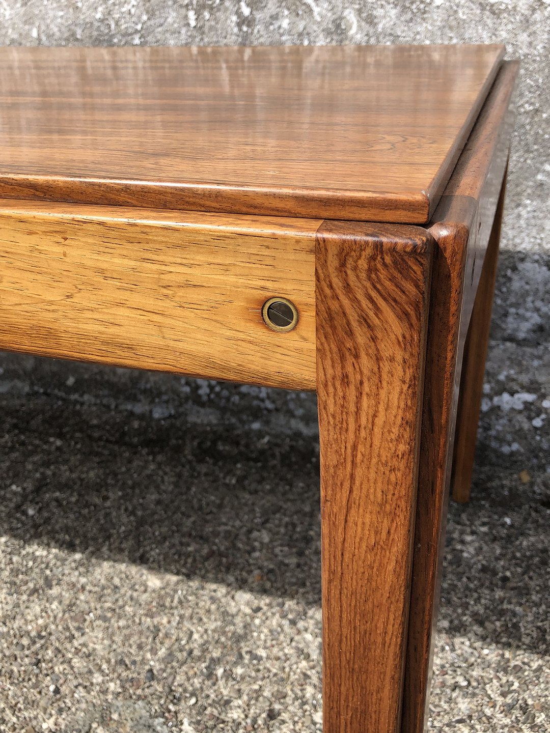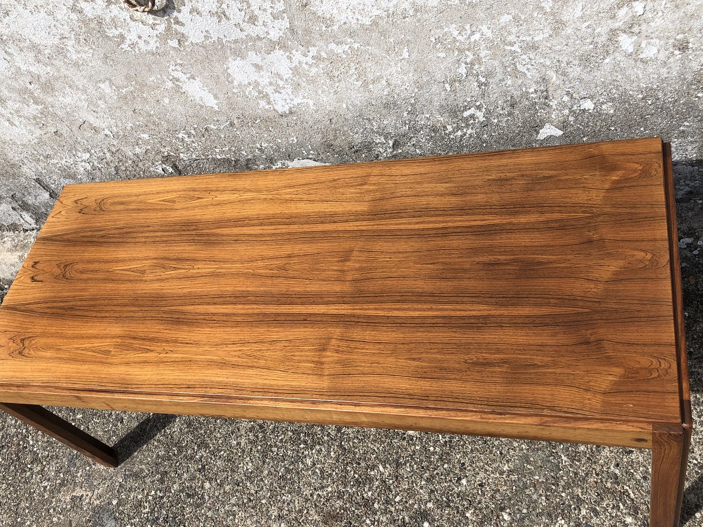 Coffee table in rosewood veneer. Danish modern. There is a circle under the plate, where there has probably been a mark with Danish furnituremakers control. Dimensions: 53x142x57 cm