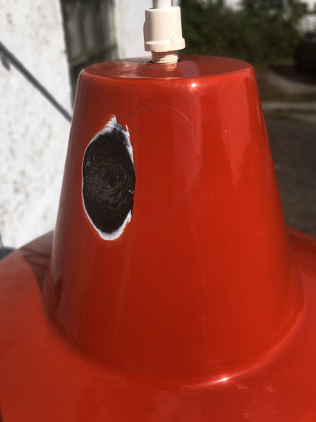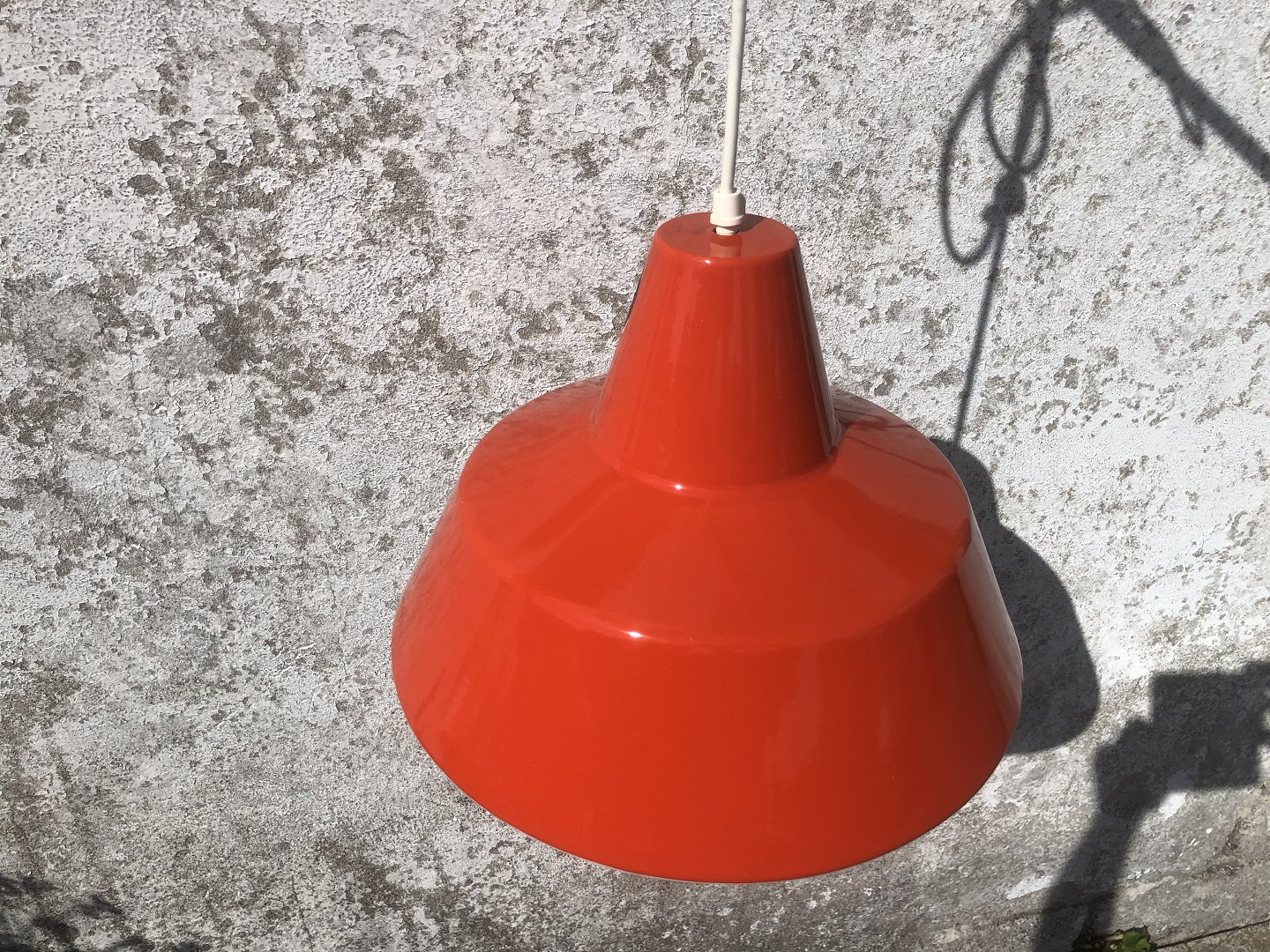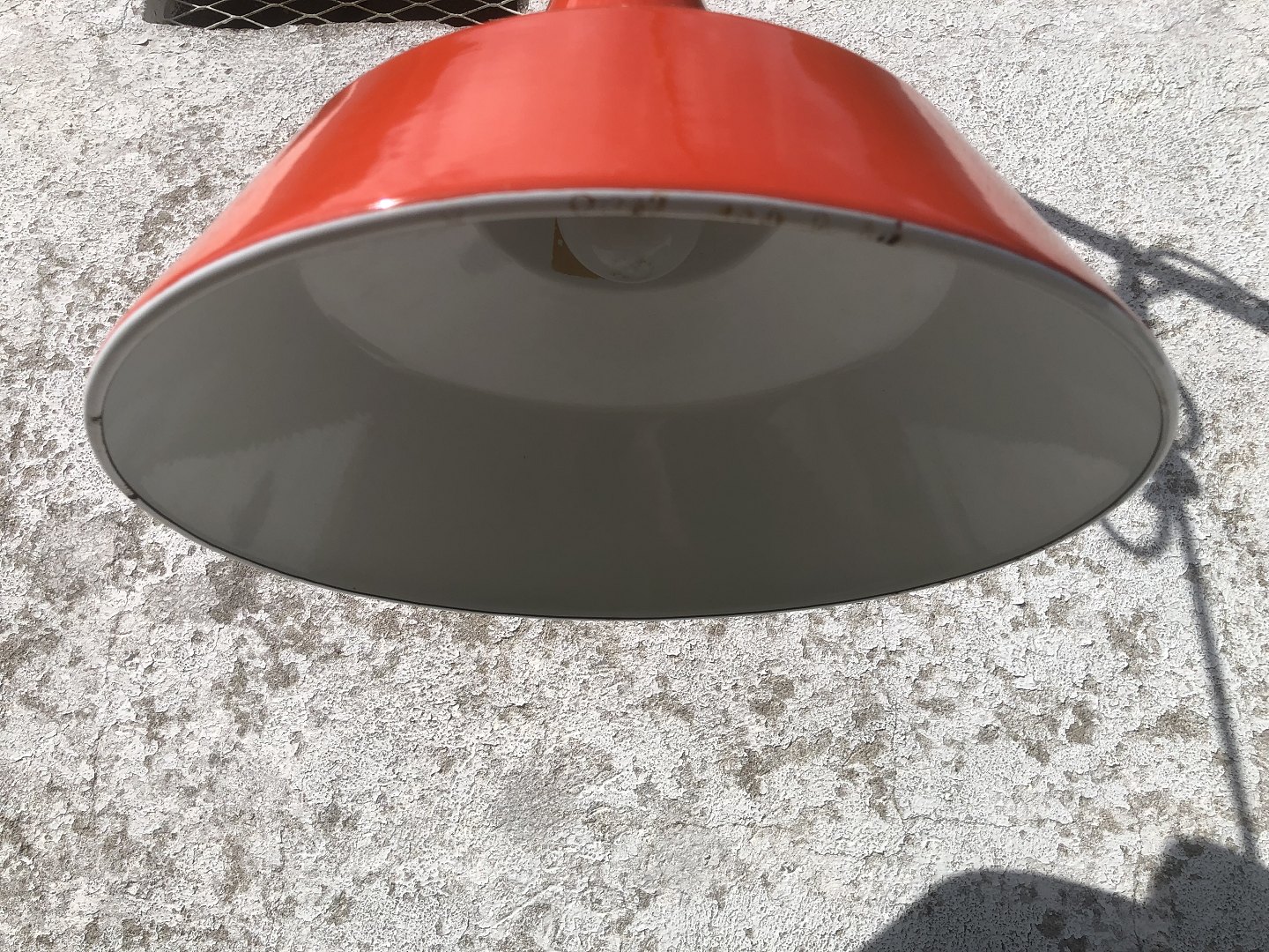 Louis Poulsen work pendant in orange enamel. 35 cm in diameter. Has a large enamel chip and several small ones (see photo)