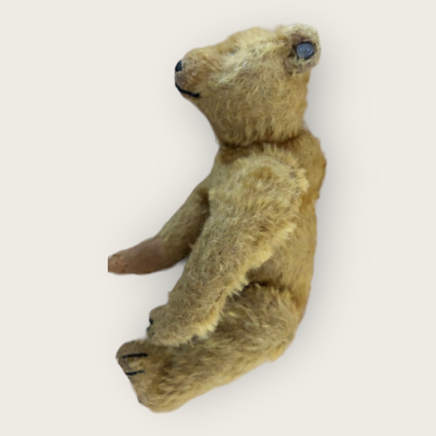 Small Steiff teddy bear from approx. year 1910, height 21 cm and with paws and feet, used condition, but whole and nice and with intact ear tag.