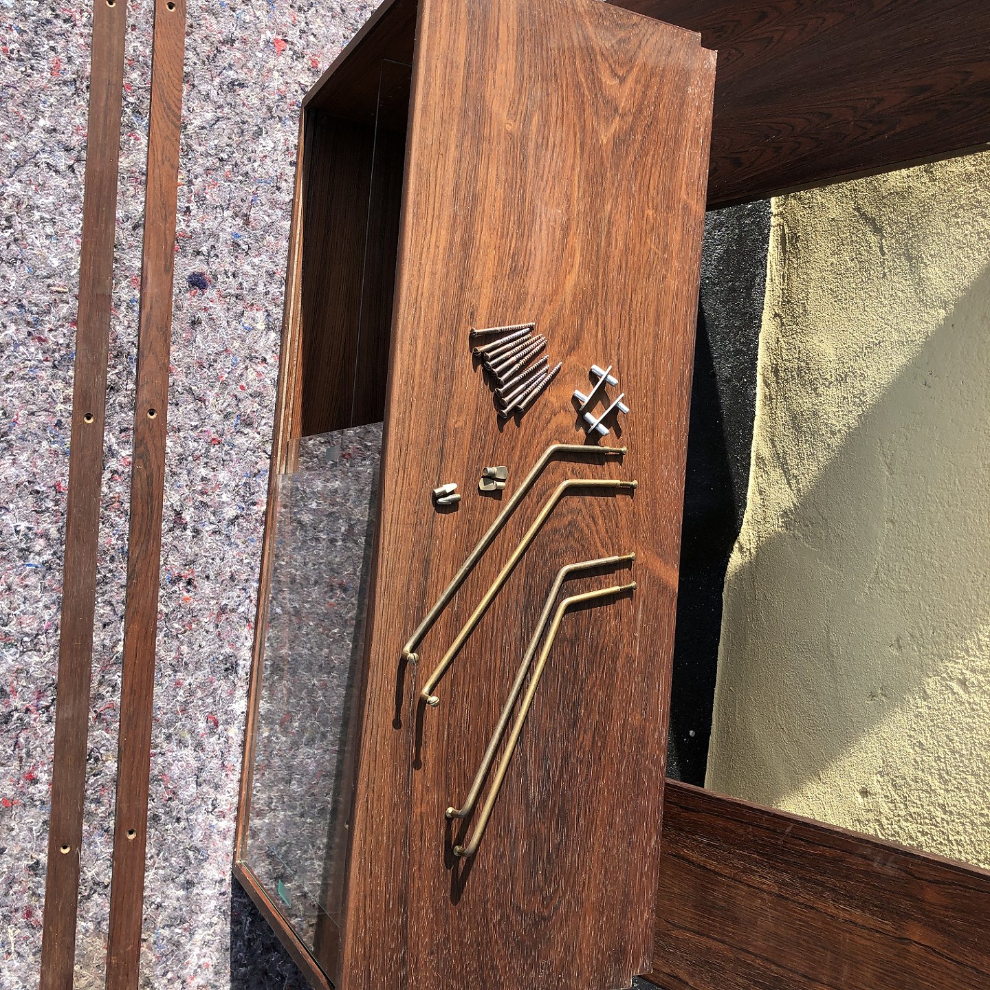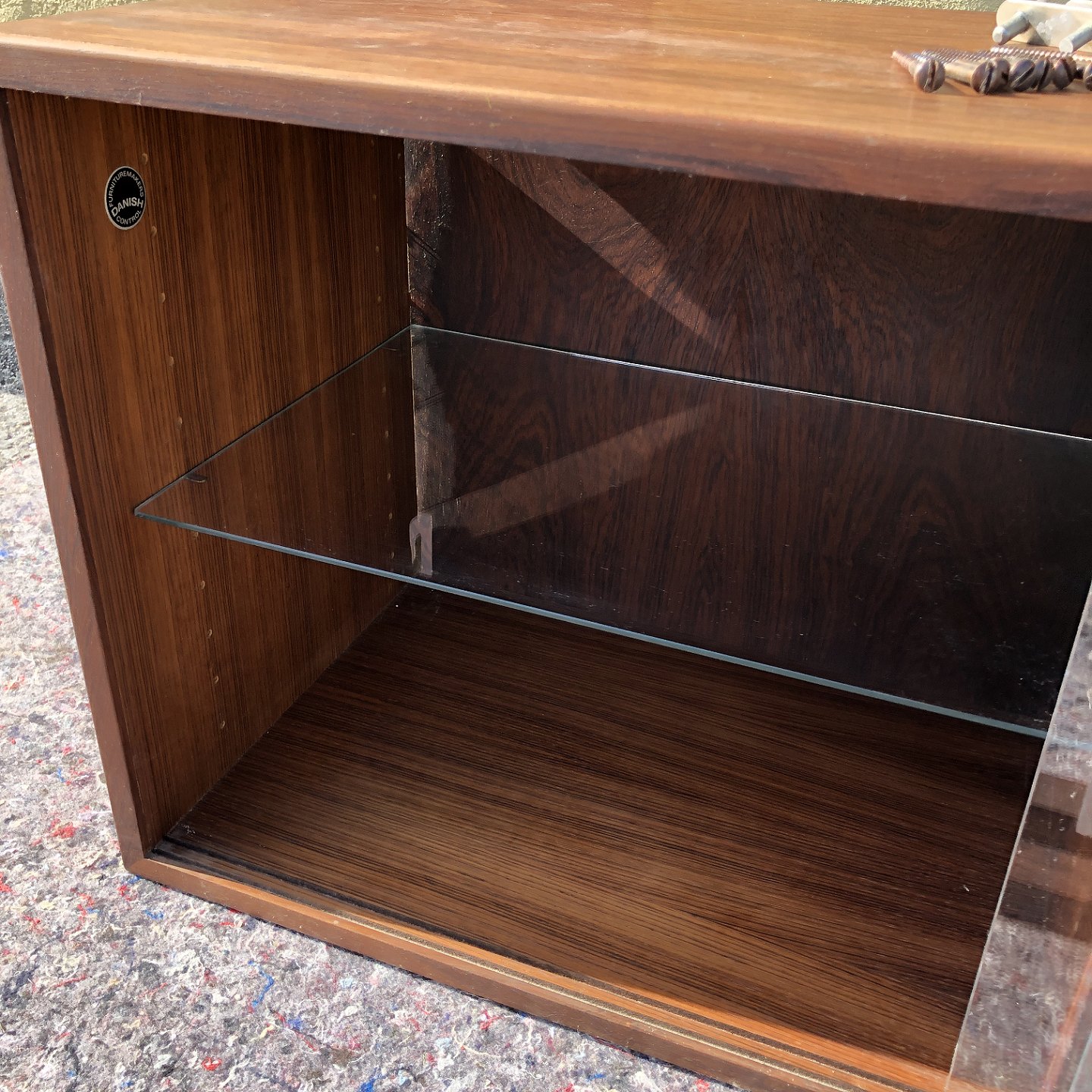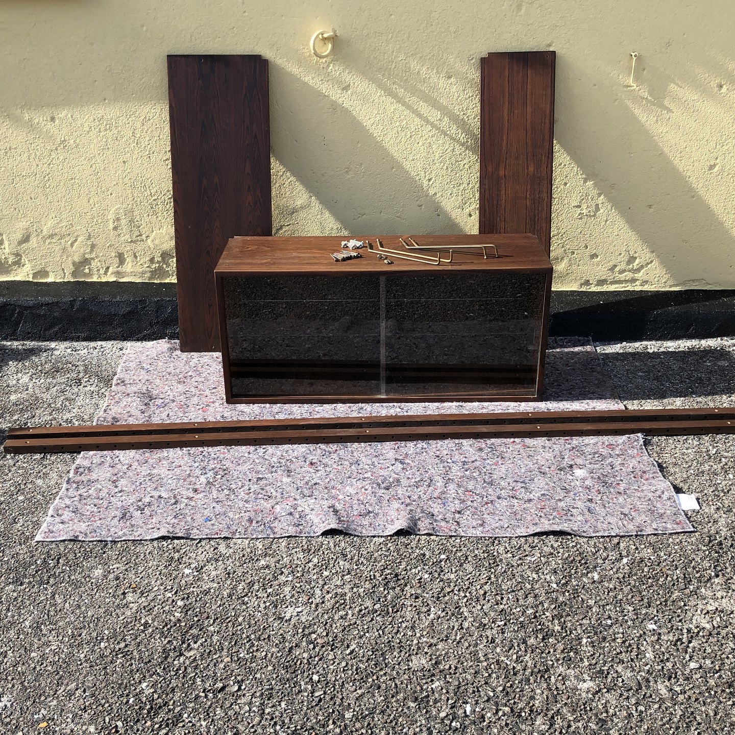 Shelving system in rosewood veneer. Cupboard with glass doors. Dimensions: cabinet 89.5x30x40 cm, shelf 89.5x30 and 89.5x22. Moldings 200 cm. Nice used condition. Marked with Danish furniture control.