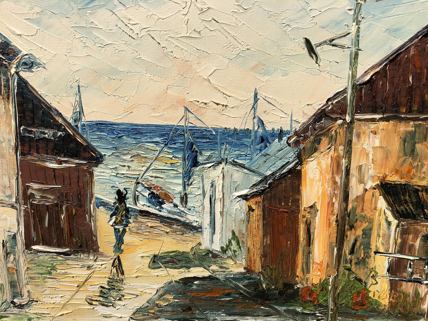Hillestrøm, Bent Bertram oil painting on canvas, Motif from Gilleleje Harbour. Dimensions with frame: 32x26 cm.