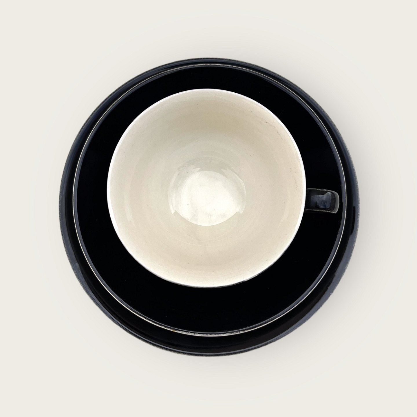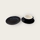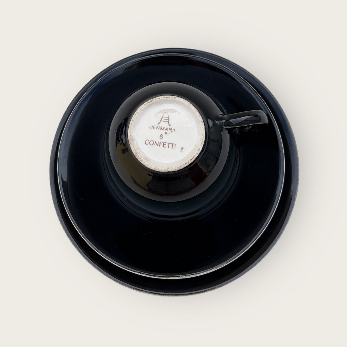 Royal Copenhagen, Aluminia, Confetti, Black teacup trio set, Plate 17cm in diameter, Cup 9.5cm in diameter, 5.5cm high *With some traces of use and a few cracks*