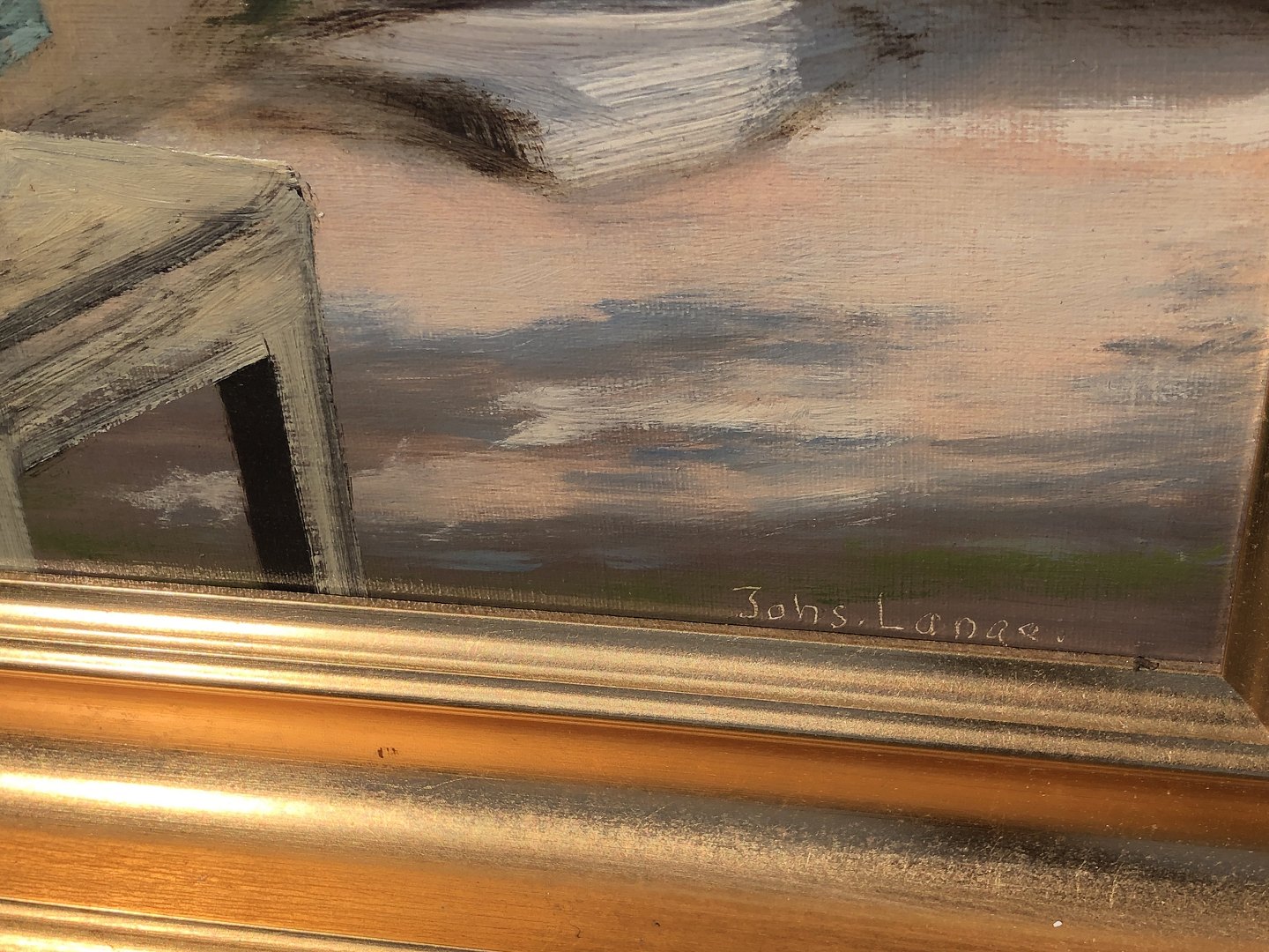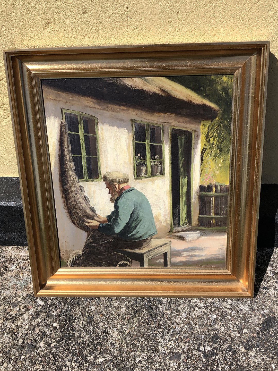 Johannes Lange, Oil painting on canvas of a fisherman who arranges nets in front of his house. Dimensions with frame 56x61 cm