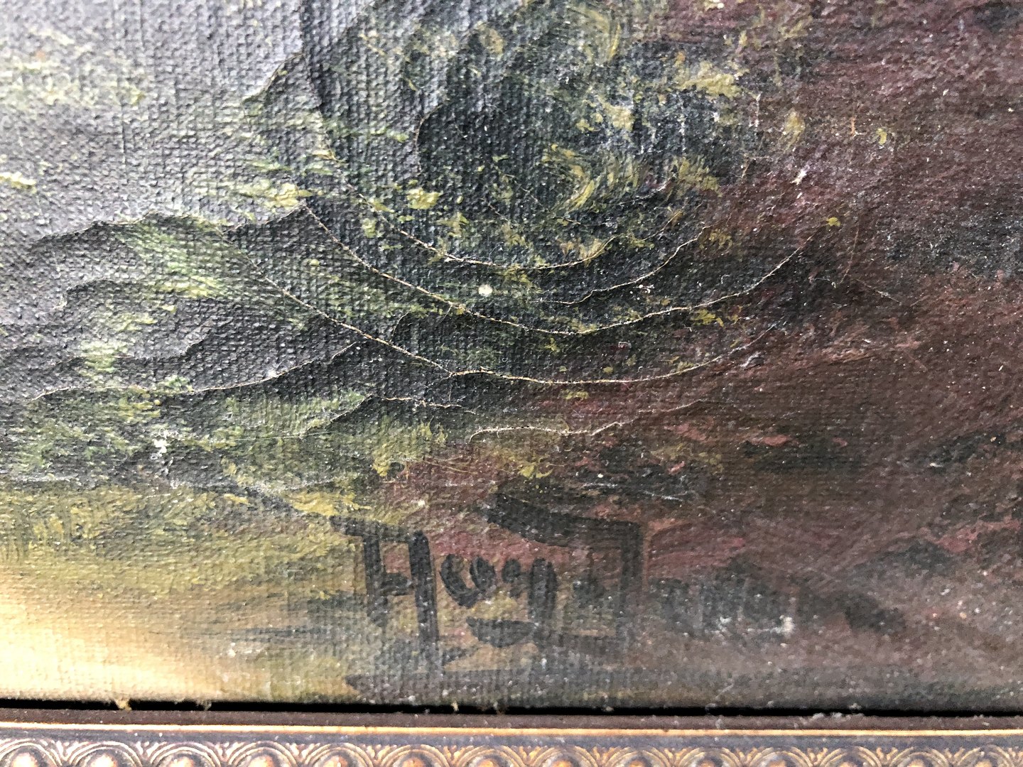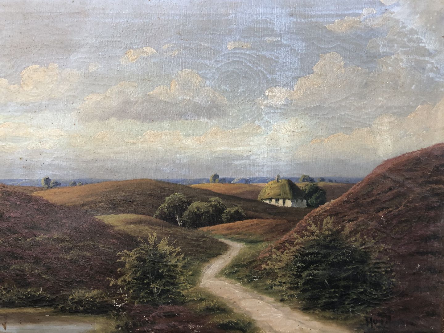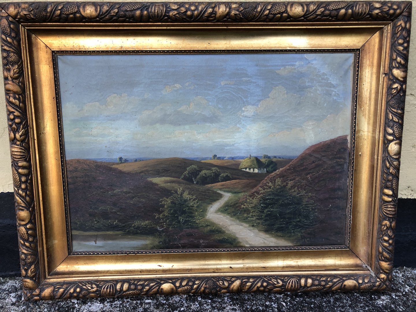 Oil painting on canvas, heather hills with road, needs surface cleaning, Dimensions with frame: 84x64 cm
