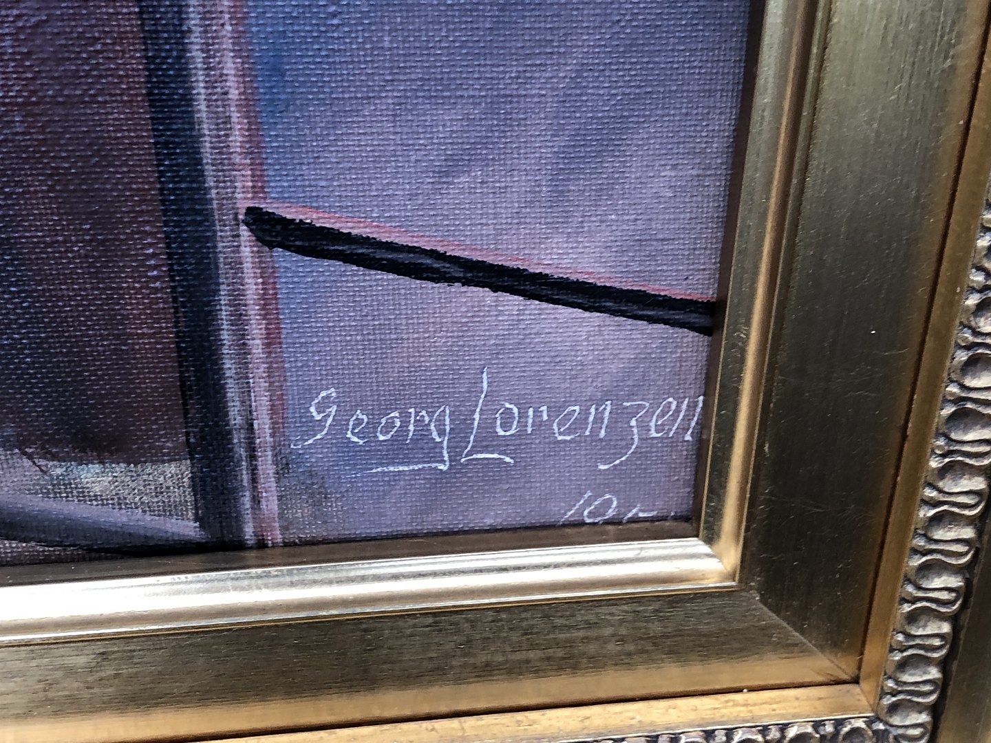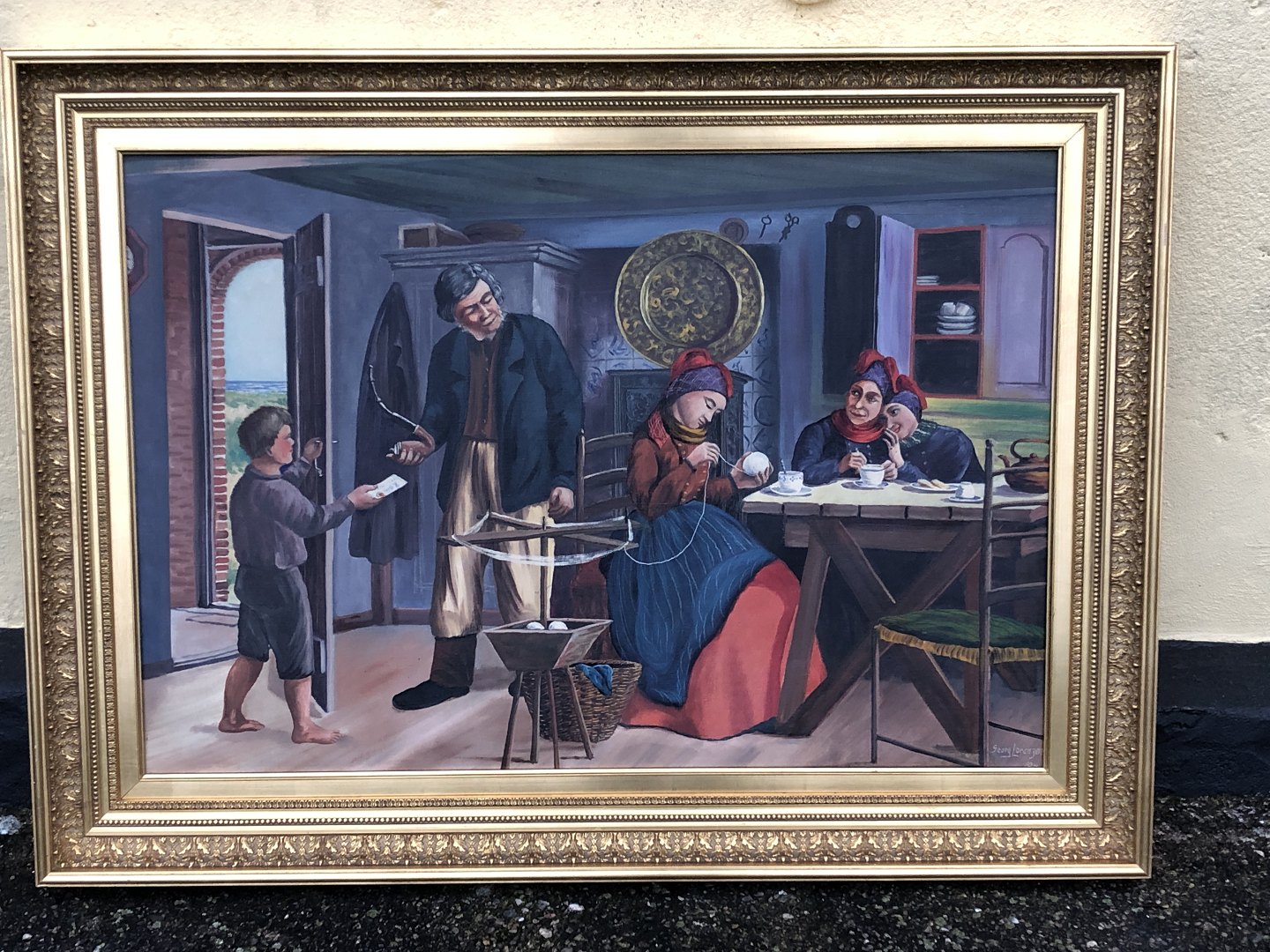 Georg Lorenzen, Women in traditional costume, presumably motif from Fanø with interior, Dimensions with frame: 115x85cm