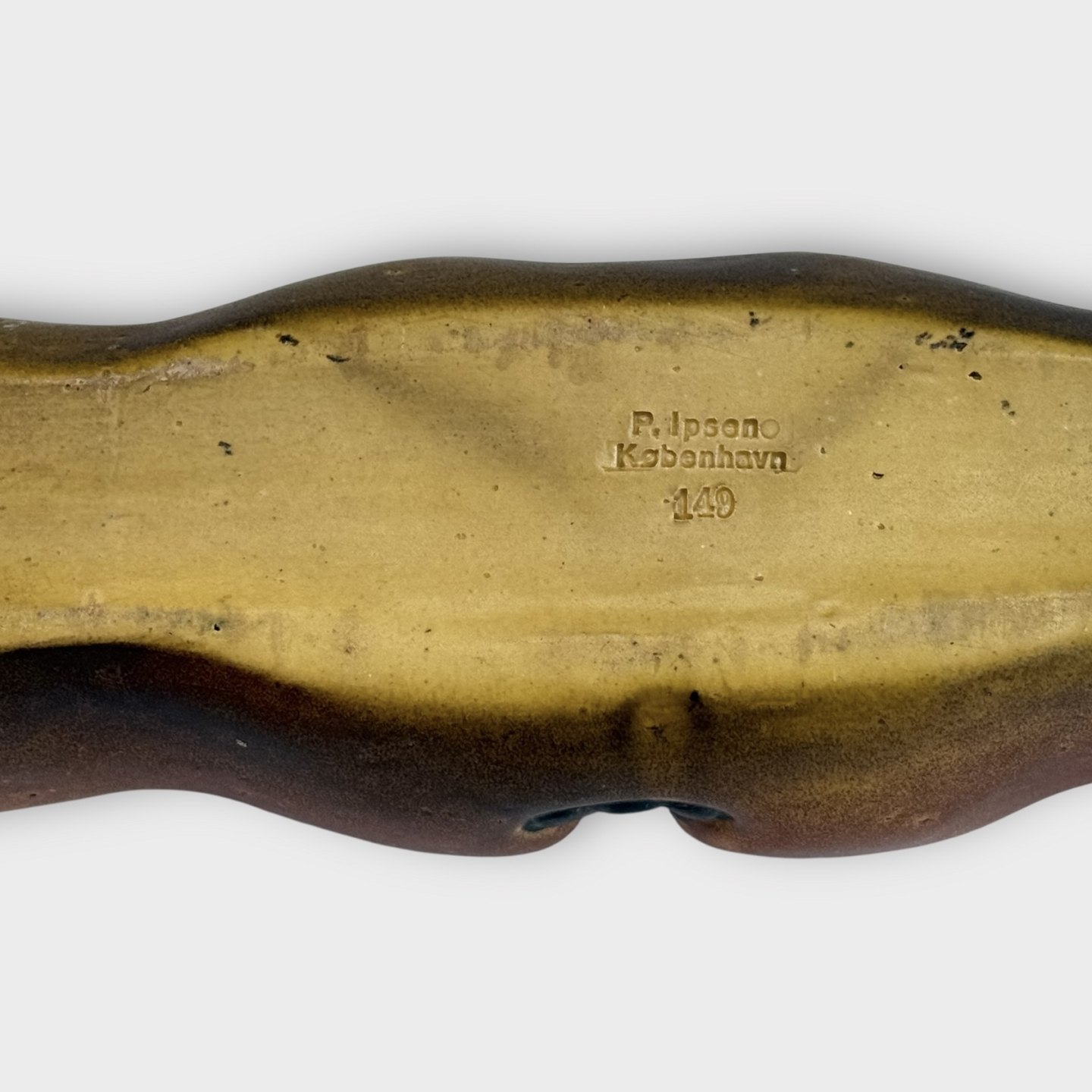 P. Ipsen Copenhagen, later P. Ipsen's Widow, Art Nouveau, Oblong bowl, 35 cm long, A few very small cracks, otherwise in good condition.