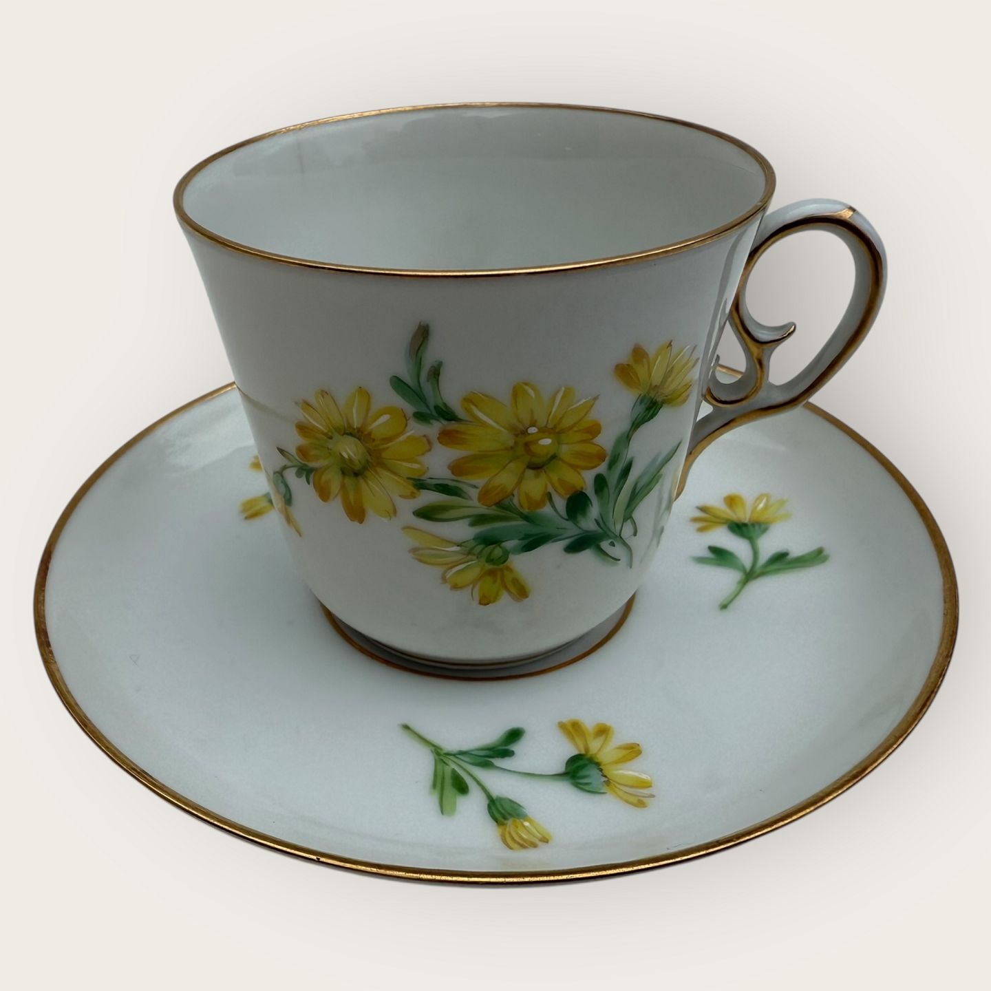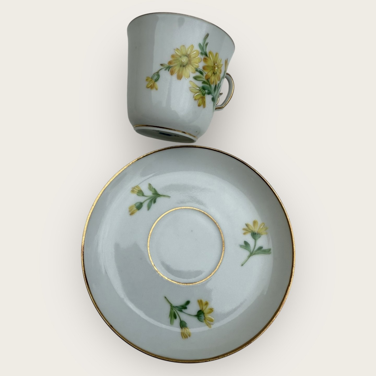 Royal Copenhagen, small coffee cup in thin porcelain decorated with yellow daisy, #9075, Cup height 5.5cm, diameter 6.3cm, saucer diameter 8.5, Nice condition
