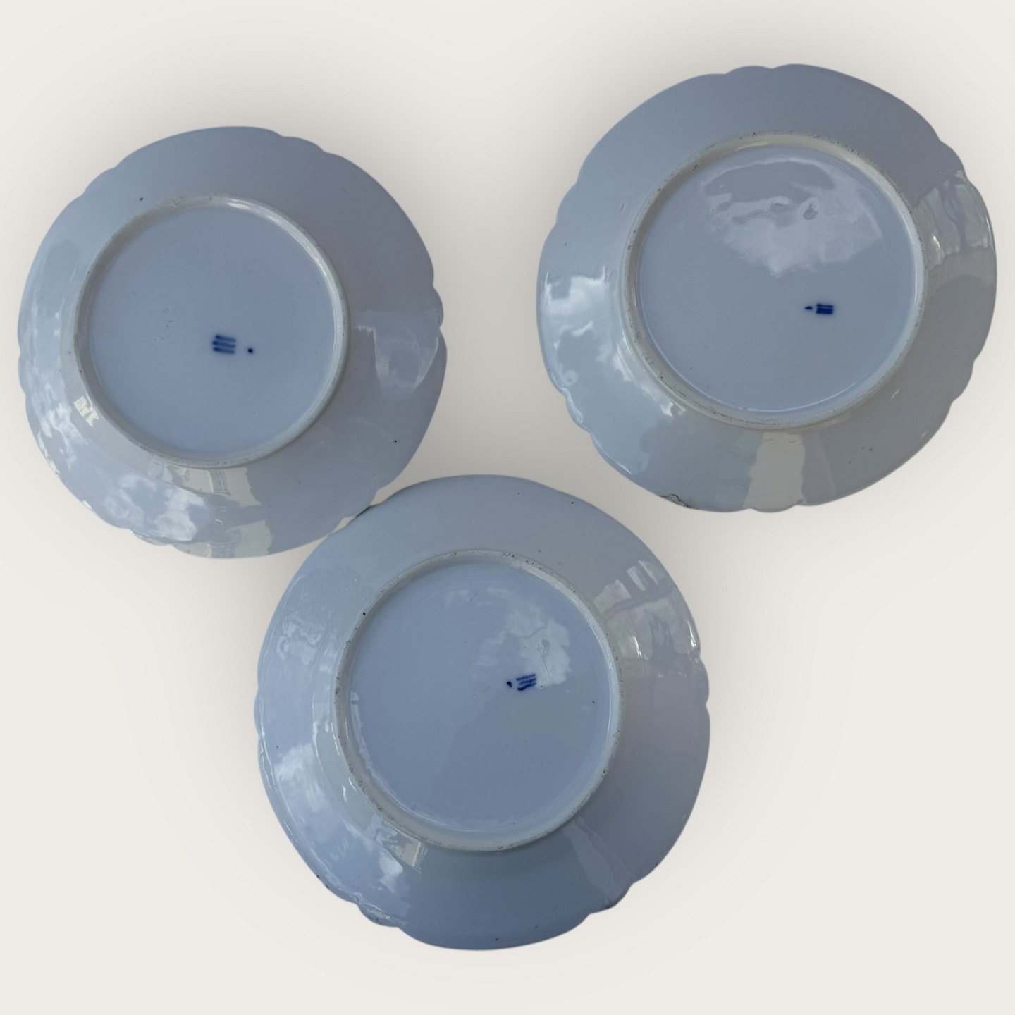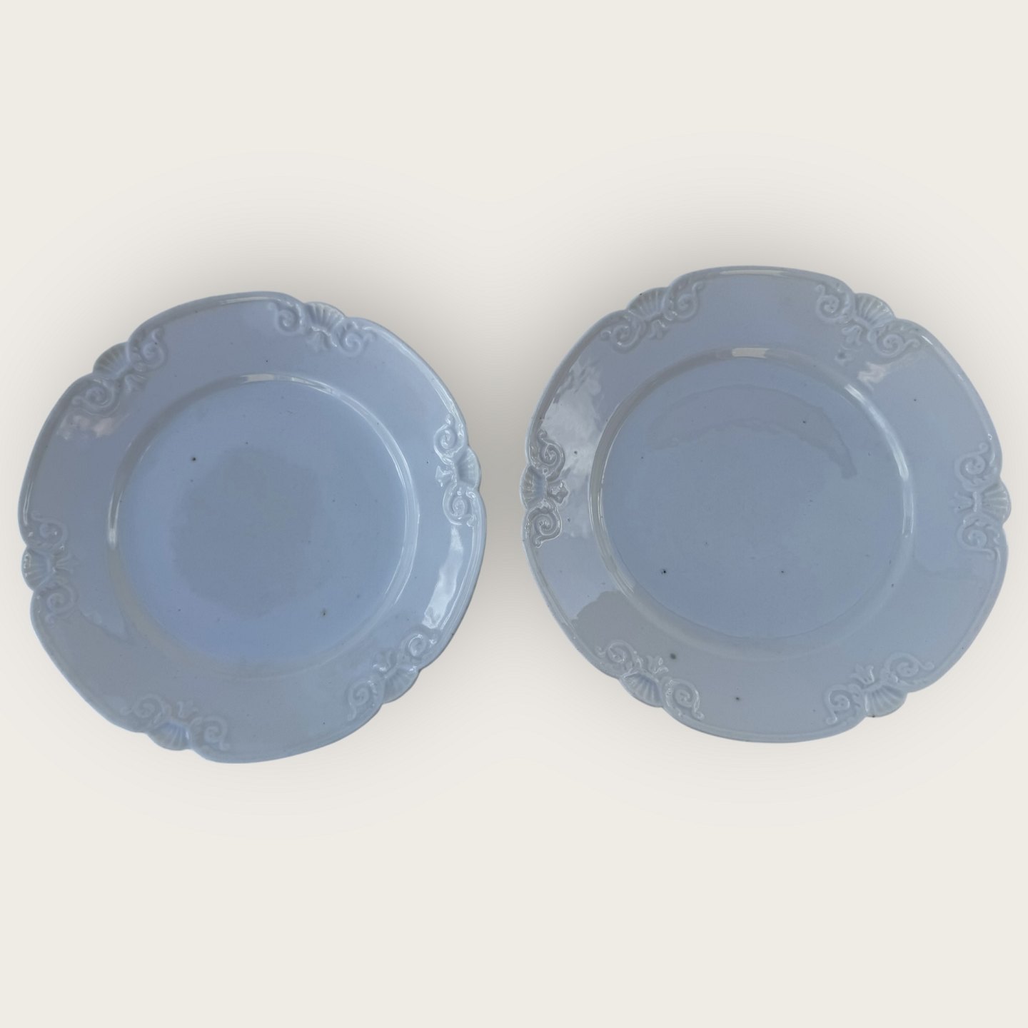 Royal Copenhagen, Rococo white / Rokoko hvid, flat plate, 19 cm in diameter, 2 pcs. in fine slightly patinated condition, we also have 3 pcs. with defects/repairs for 125kr each (see last 2 photos)