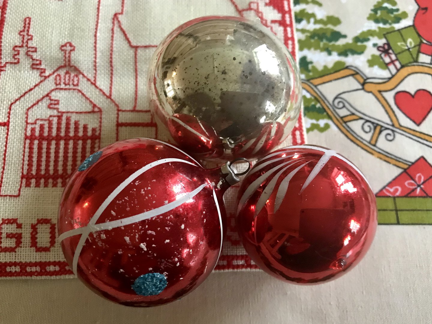 Ältere Große Weihnachtskugeln, Box mit Rot & Silber, 12 Stück, * Charming Patinated *