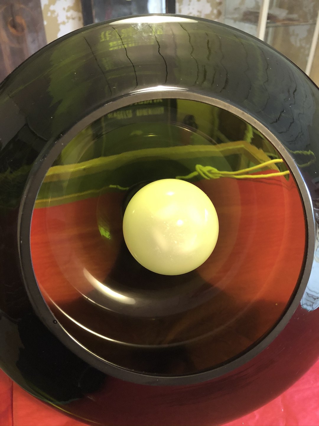 Große grüne Glaslampe aus den 1960er Jahren. Sehr guter Zustand mit Ausnahme sehr kleiner Kratzer am unteren Rand - siehe Foto. Höhe 35 cm, Durchmesser 28 cm.